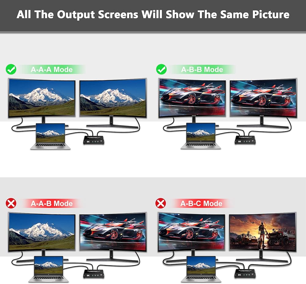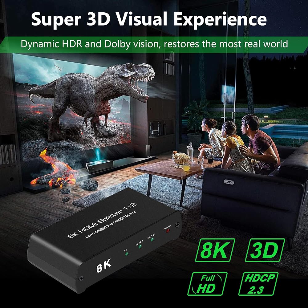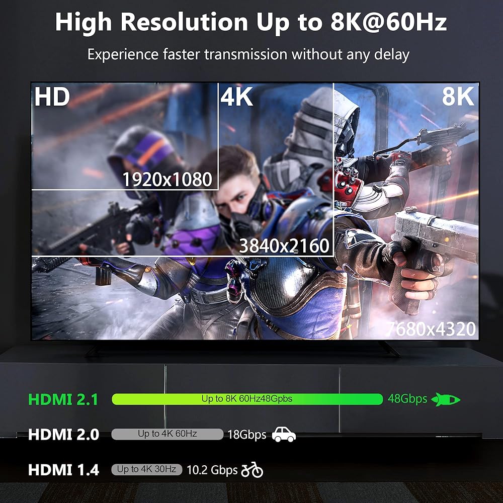 دقة 8K Ultra HD: يمكن لمقسم HDMI للشاشة المزدوجة أن يدعم 8K@60 هرتز، 4K@120 هرتز، 1080P@240 هرتز، يمكنه قياس الدقة تلقائيًا لتتناسب مع التلفزيون الخاص بك. يدعم دقة مختلفة 8K&4K / 4K&1080P تعمل بشكل متزامن. يمكن أن يصل الحد الأقصى لمعدلات النقل إلى 48 جيجابت في الثانية، لتجربة نقل أسرع دون أي تأخير. يدعم أيضًا HDMI 2.1، HDCP 2.3، HDR 10، Doby Vision.