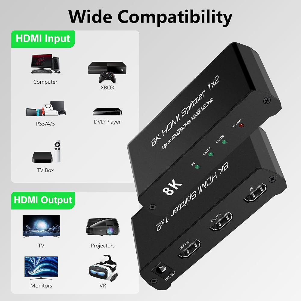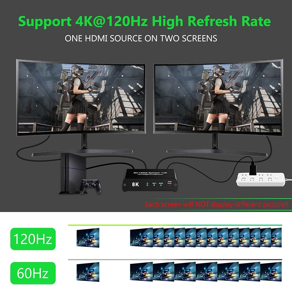 معدل تحديث عالٍ 4K@120 هرتز: يوفر معدل التحديث العالي 120 هرتز صورة أكثر سلاسة وأكثر وضوحًا على التلفزيون الخاص بك دون أي تأخير وجودة صورة ضبابية عالية في الألعاب، واستمتع بتأثير الألعاب عالي الجودة. يُعد مقسم HDMI بدقة 8K هذا شريكًا رائعًا لوحدات تحكم الألعاب ثنائية اللاعبين. الإدخال: PS5، PS4، سلسلة Xbox، نينتندو سويتش، Apple TV، Fire Stick، Roku، DVD. الإخراج: تلفزيون، جهاز عرض، شاشة.