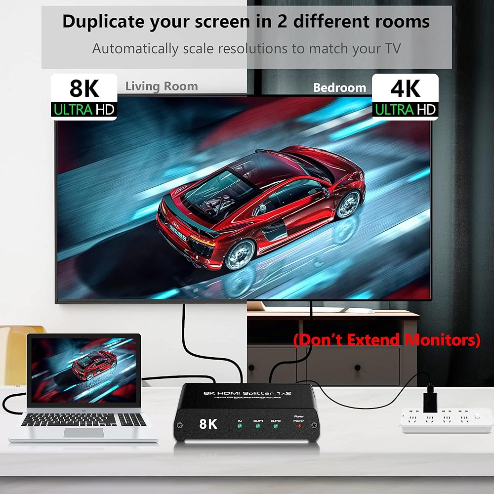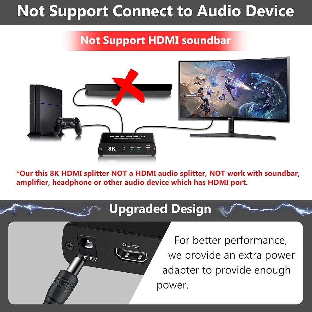 ما تحصل عليه: 1 × 8K@60 هرتز، 1 × محول طاقة تيار مستمر 5 فولت، 1 × دليل المستخدم. يعد Avedio Links HDMI 2.1 Splitter 4K 120 هرتز خيارًا مثاليًا لكل من اللاعبين ومحبي الأفلام، ويقدم لك جودة صورة مذهلة وصوتًا فاخرًا. ⚠ لا يدعم توسيع الشاشة، ستعرض شاشتا إخراج HDMI نفس المحتوى، فقط النسخ/النسخ/المرآة.