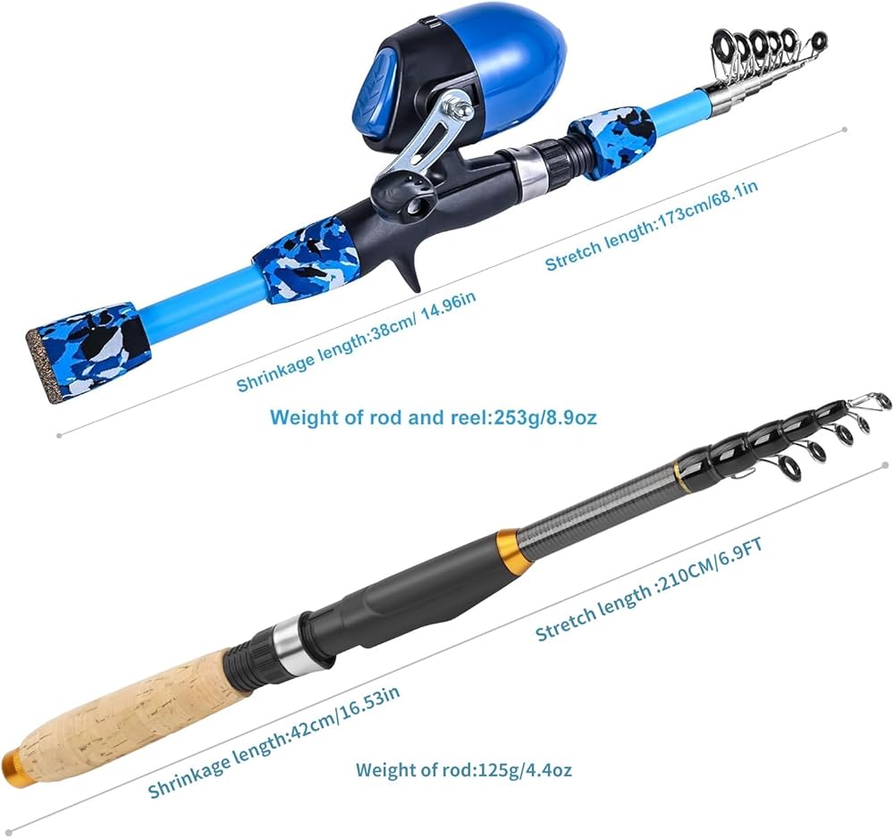 🐠【قضبان متينة】صنارة الصيد الدوارة التلسكوبية مصنوعة من ألياف الكربون والألياف الزجاجية من أجل المرونة والمتانة. مقبض EVA المريح مريح، مما يعني أنه يمكنك الصيد لفترة أطول. قضيب صيد بطول 6.9أقدام للبالغين يمكن أن يمنحك المزيد من القوة. مجموعة صنارة الصيد بطول 1.6 متر/5.24 قدم هي حجم ووزن مثاليين للأطفال.