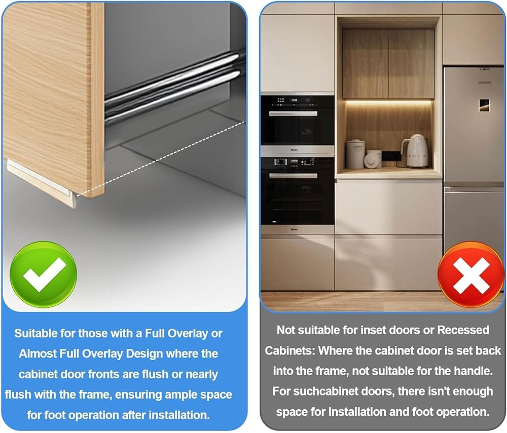 هل هو مناسب؟ يُعد سحب القدم لباب الخزانة الخاص بنا مناسبًا لمعظم الخزانات الحديثة، خاصة تلك ذات التصميمات ذات التغطية الكاملة أو التغطية الكاملة تقريبًا حيث يكون الجزء السفلي من باب الخزانة متسقًا مع الإطار أو تقريبًا. إذا كانت الخزانة الخاصة بك عبارة عن خزانة مدمجة حيث يعود باب الخزانة إلى الإطار، فيرجى الشراء بحذر
