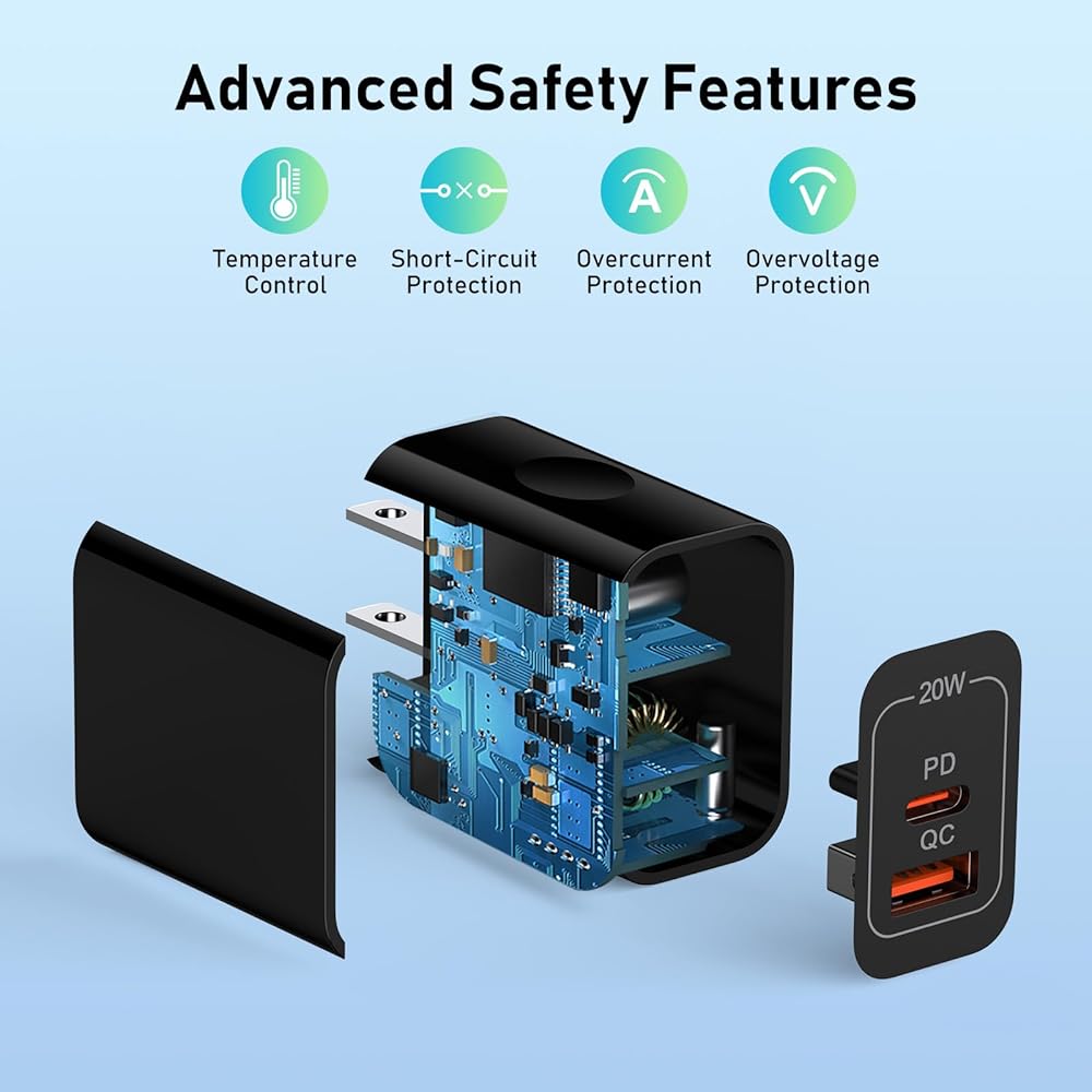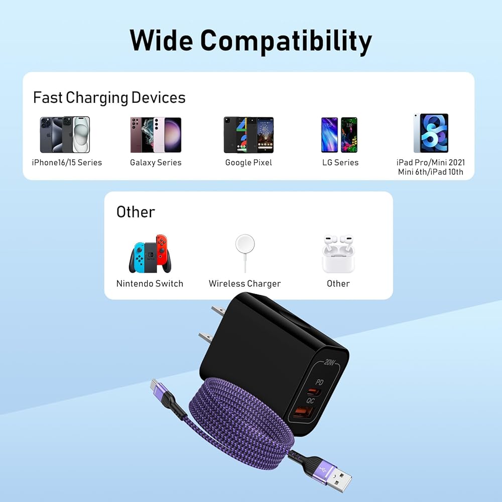 توافق واسع لشاحن سامسونج: استخدم قالب شاحن سامسونج USB مزدوج المنفذ بقدرة 20 وات مع سلك شاحن USB A-C للشحن السريع لهاتف Samsung Galaxy A55/A15/A35/A16، Galaxy S24 FE/S24/S24 Ultra/S24+/S23 FE/S23 Ultra /S23/S23+/22 الترا 5G/S22 5G/S22+ 5G/S21 FE 5G/S21 5G/S21 Ultra 5G/S21+ 5G/S21/S20/S20+/S20+ 5G/S20 FE 5G/S20 Ultra UW/S10/S10e/S10+/S10 Lite/S9/S9+/S8، لهاتف iPhone/ iPad Pro /Air/Mini، لـ Google Pixel والمزيد