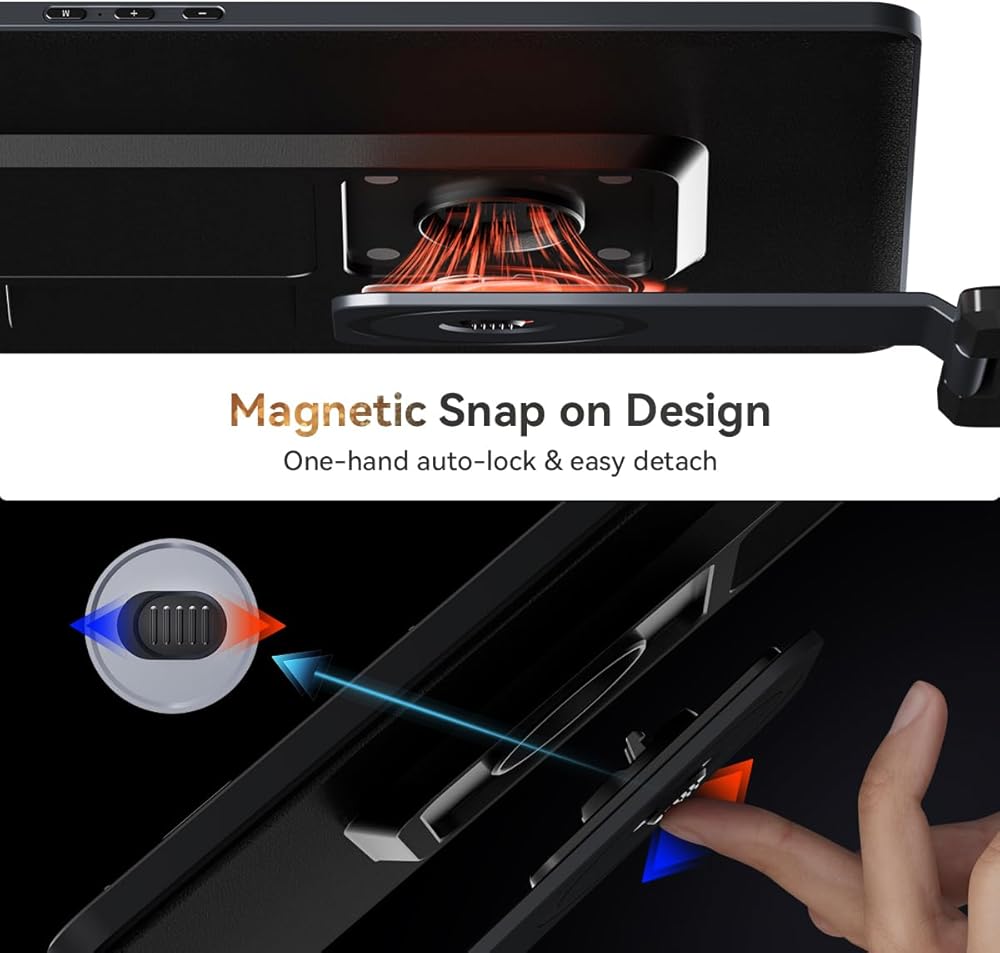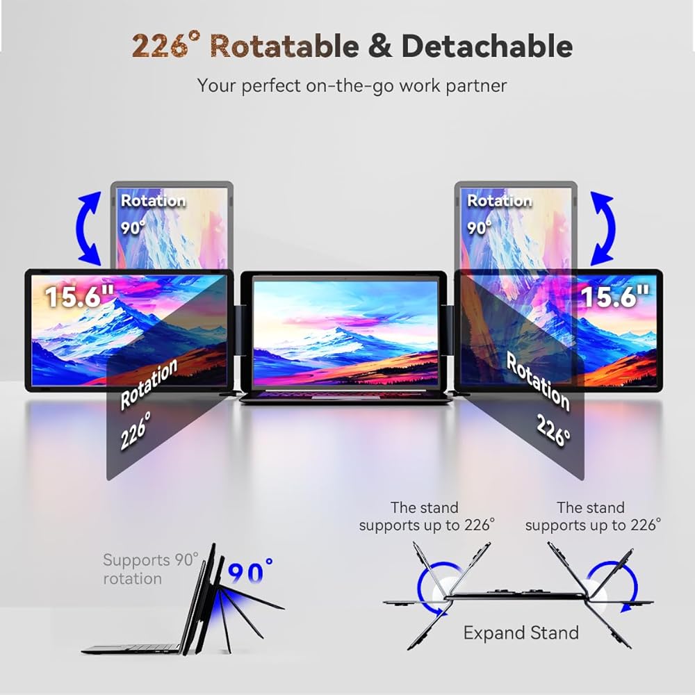 حامل داعم ثابت: تتميز الشاشة الثلاثية المحمولة للكمبيوتر المحمول بحامل قابل للتمديد في الخلف. يمكنك سحب الدعامة الخلفية بالضغط على الزر. من خلال هذا الحامل الداعم، يمكن لشاشة الكمبيوتر المحمول المزدوجة الخاصة بنا تجنب اهتزاز الشاشة، وعدم الاستقرار، والسقوط أثناء الاستخدام.