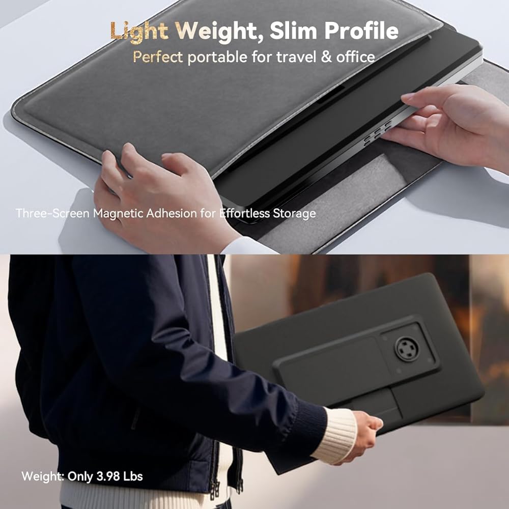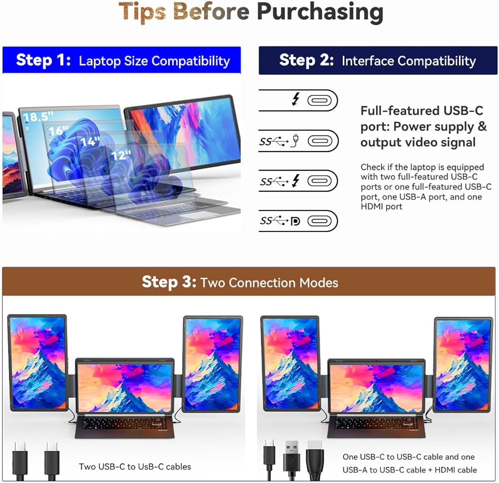 التوصيل والتشغيل: يرجى التأكد من وجود أكثر من منافذ TYPE-C (يجب أن تدعم نقل الفيديو) على الكمبيوتر المحمول الخاص بك قبل الشراء، يمكن توصيل موسع الكمبيوتر المحمول الثلاثي هذا عبر النوع C أو HDMI. عندما يتم توصيل الشاشة وتشغيلها، ستضيء تلقائيًا وتكون جاهزة للاستخدام. يتم توفير كابلات Type-C وكابلات HDMI وكابلات USB-A إلى USB-C ومحول الطاقة وحقيبة الحمل في العبوة.