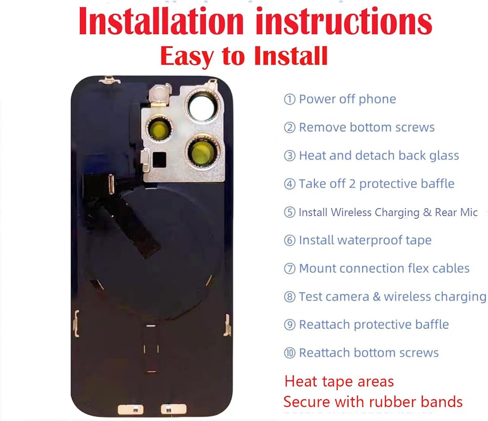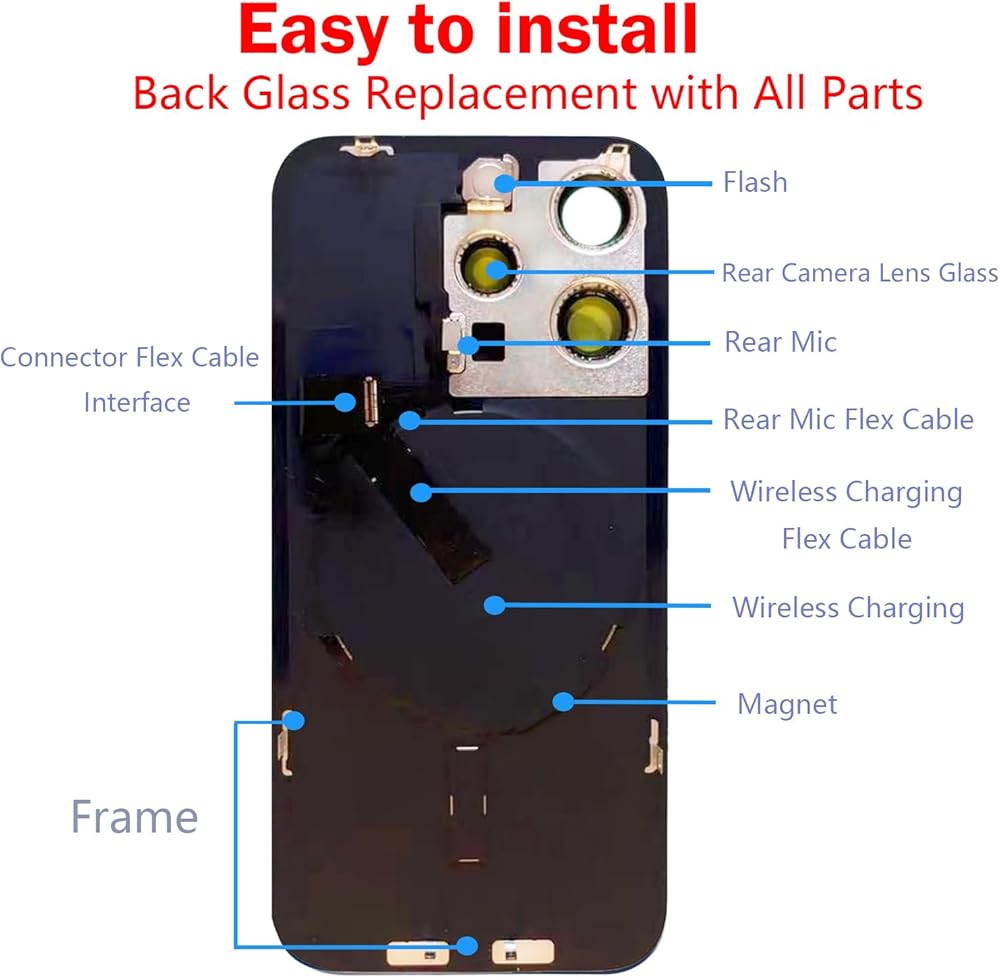 • 【Pre-installed Back Cover all Components】15 Pro 6.1 inch back glass assembly includes: Back glass with plate and bracket, camera module (camera bracket, camera lens glass, flash, and flash flex cable), rear mic (rear mic and rear mic flex cable), wireless charging module (wireless charger and wireless charging flex cable), magnets, and the phone connection flex cable.