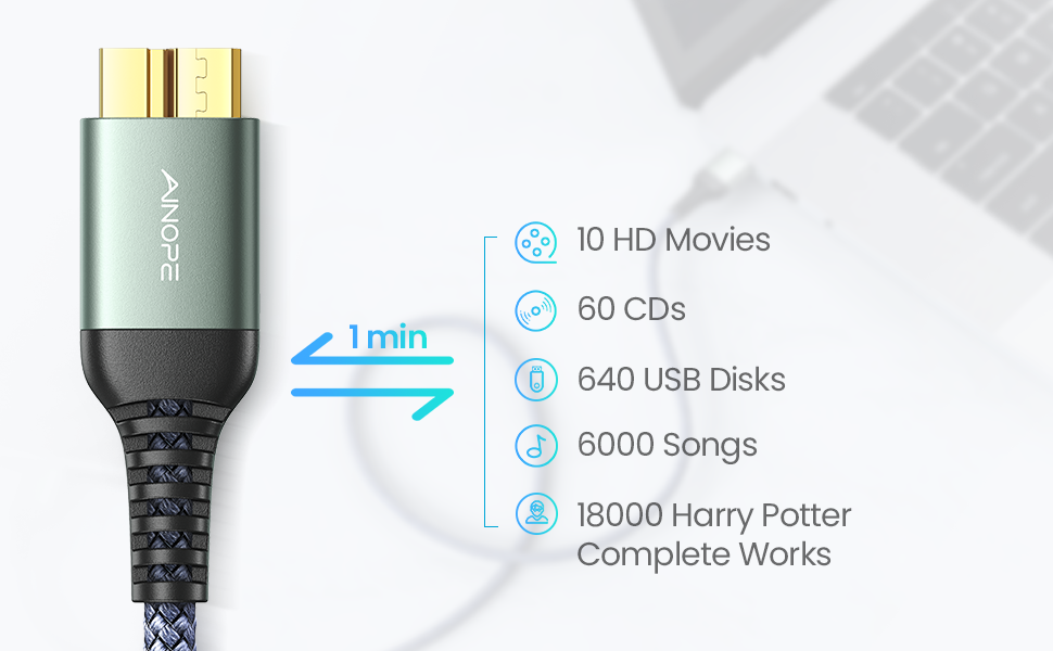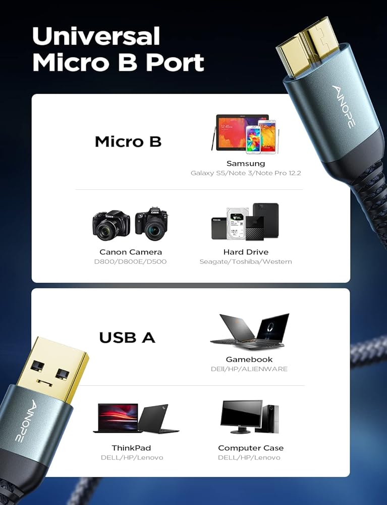 • توافق عالمي: يتوافق سلك القرص الصلب الخارجي هذا مع Samsung Galaxy S5، وGalaxy Note 3، وGalaxy Note Pro 12.2، والأقراص الصلبة الخارجية USB 3.0 المحمولة بما في ذلك Toshiba Canvio، وSeagate FreeAgent، وWestern Digital (WD) My Passport وElements. .