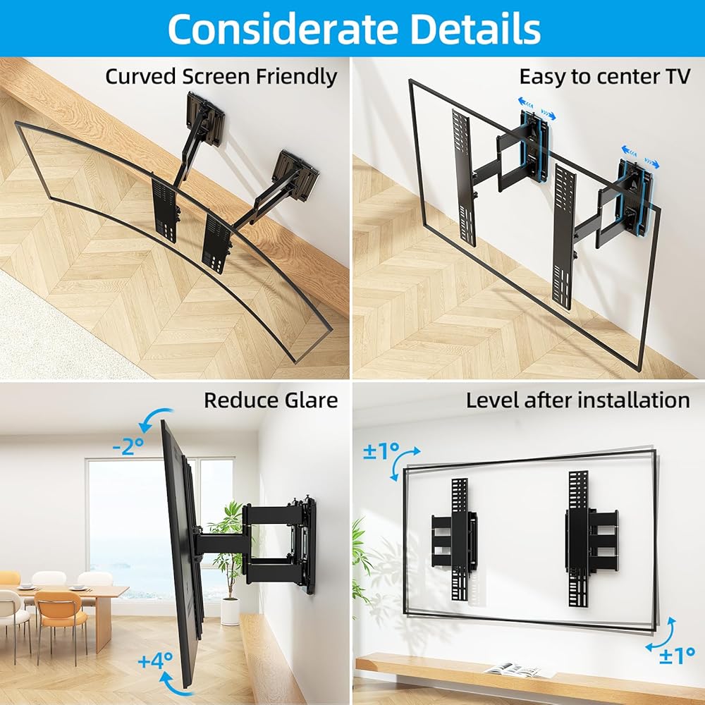 ترقية تجربة المشاهدة: يعمل حامل التلفزيون ذو الحركة الكاملة على إمالة التلفزيون لأعلى بمقدار 5 درجات ولأسفل بمقدار 15 درجة لتقليل الوهج، ويتميز حامل التلفزيون بنطاق دوار +/-64 درجة يسمح للتلفزيون بالتحرك بمرونة. يسمح لك مستوى ما بعد التثبيت بضبط موضع التلفزيون الخاص بك بمقدار +/-3 درجة بعد التركيب، مع حامل الحائط التلفزيوني كامل الحركة هذا، يمكنك الحصول على تجربة مشاهدة أكثر غامرة
