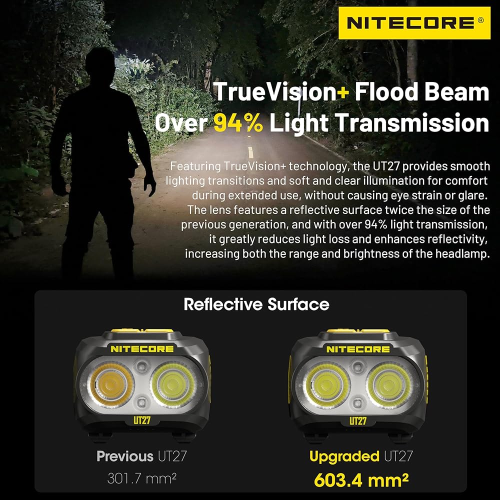 The lens of the UT27 has double the reflective surface of the previous one and achieves over 94% light transmission. This significantly cuts light loss and boosts reflectivity, increasing both the reach and brightness of the headlamp. With TrueVision+ technology, it offers smooth lighting transitions and soft, clear illumination that remains comfortable for extended use, avoiding eye strain and glare.