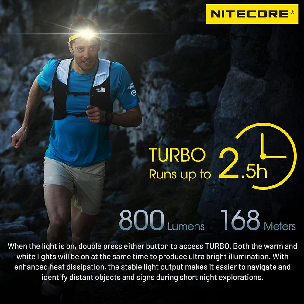 A double-click on either button activates the TURBO level. Both the warm and white lights turn on simultaneously, delivering a maximum output of 800 lumens and a range of 168 meters, perfect for brief explorations in the dark or quickly spotting distant road signs and conditions. The enhanced heat dissipation at the TURBO level also ensures stable and lasting brightness for up to 2.5 hours.