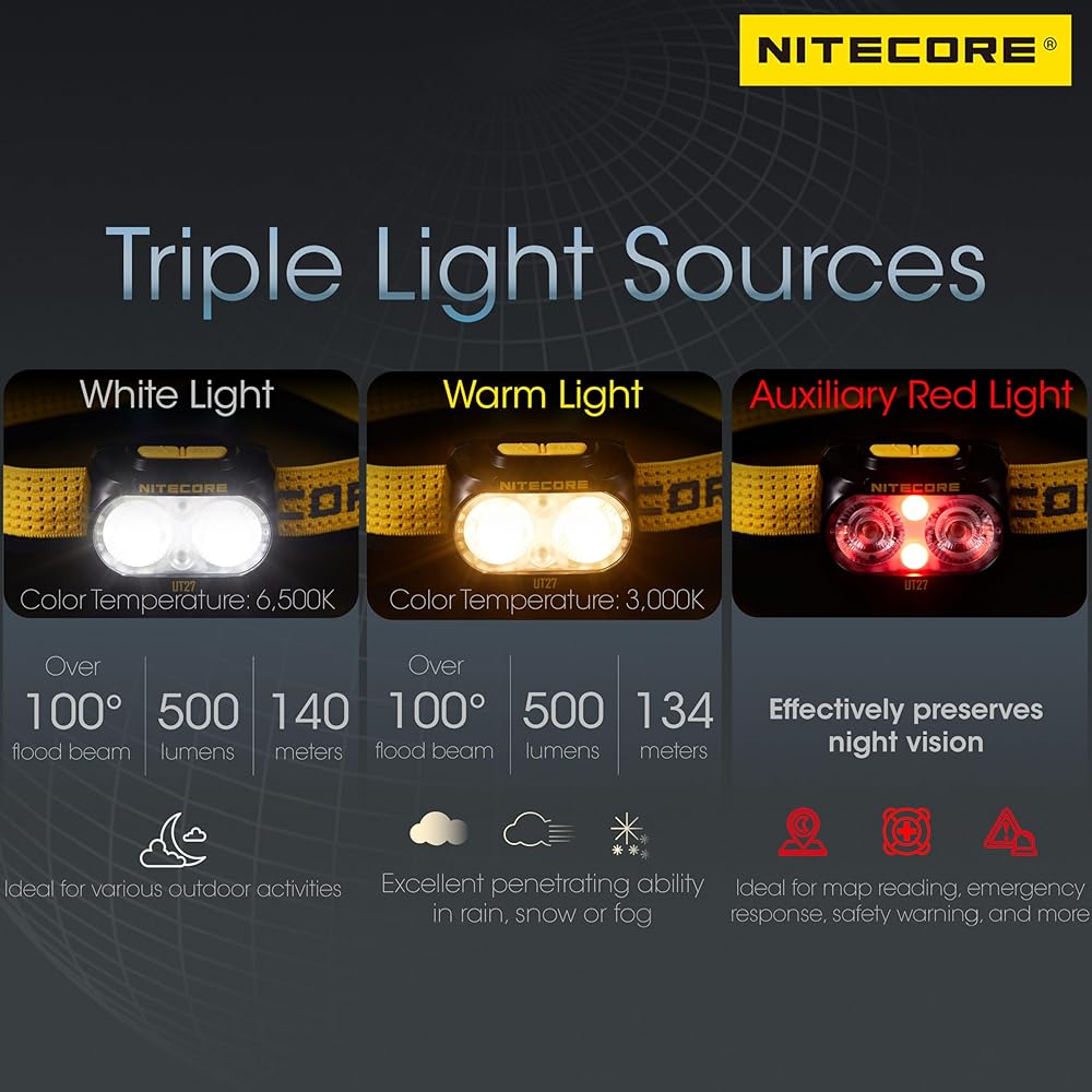Despite enhancements in luminous efficiency, beam distance, and runtime, the UT27 maintains a lightweight body at just 74g (2.61 oz) (bracket, headband, and battery included), making it comfortable to wear for extended periods. It boasts a triple light source design with white light (color temperature: 6,500K), warm light (color temperature: 3,000K), and an auxiliary red light to accommodate various lighting needs.