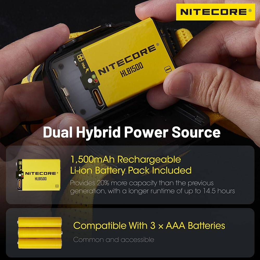 The UT27 includes a NITECORE HLB1500 (1,500mAh) Li-ion battery pack, offering 20% more capacity than its previous generation and up to 14.5 hours of battery life. It is also compatible with three AAA batteries for easy swapping and continuous use. The headlamp features a glow-in-the-dark battery compartment for easy identification and replacement in dark conditions. The battery compartment opens a full 180 degrees for hassle-free access, and the adjustable headlamp bracket tilts up to 90 degrees, ensuring comprehensive nighttime illumination.