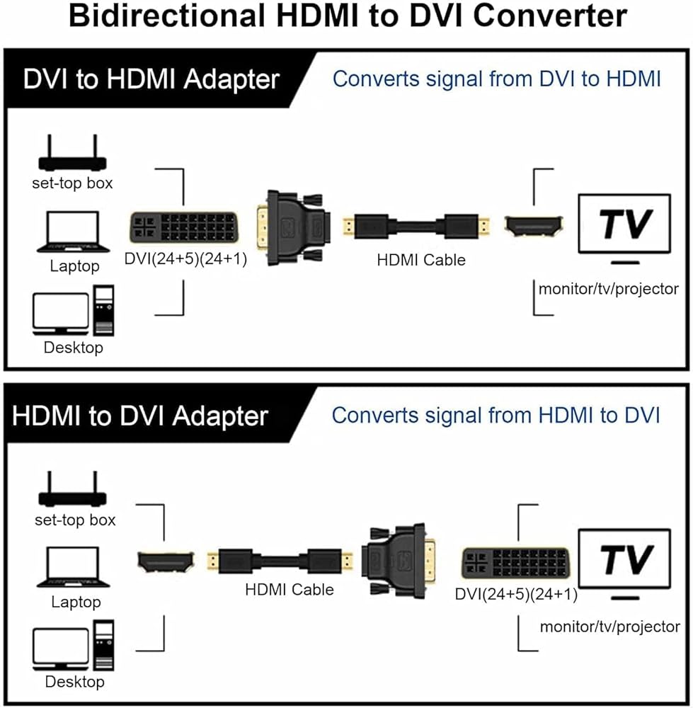 هذا محول HDMI-DVI ثنائي الاتجاه، يعمل مع جميع أجهزة واجهة DVI-D(24+1)/(24+5) وHDMI، مثل الشاشة، HDTV، جهاز العرض، الكمبيوتر، مشغل Blu-ray، التلفزيون مربع ووحدة التحكم في الألعاب.
