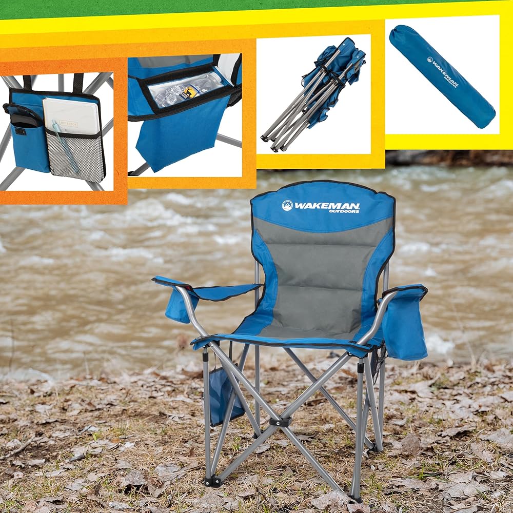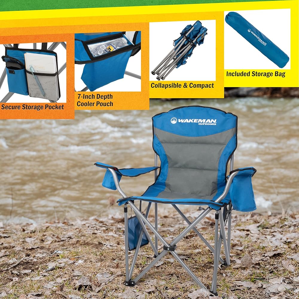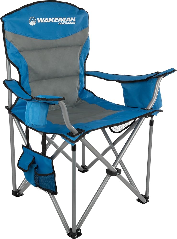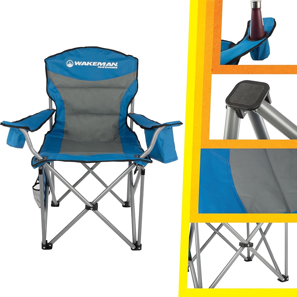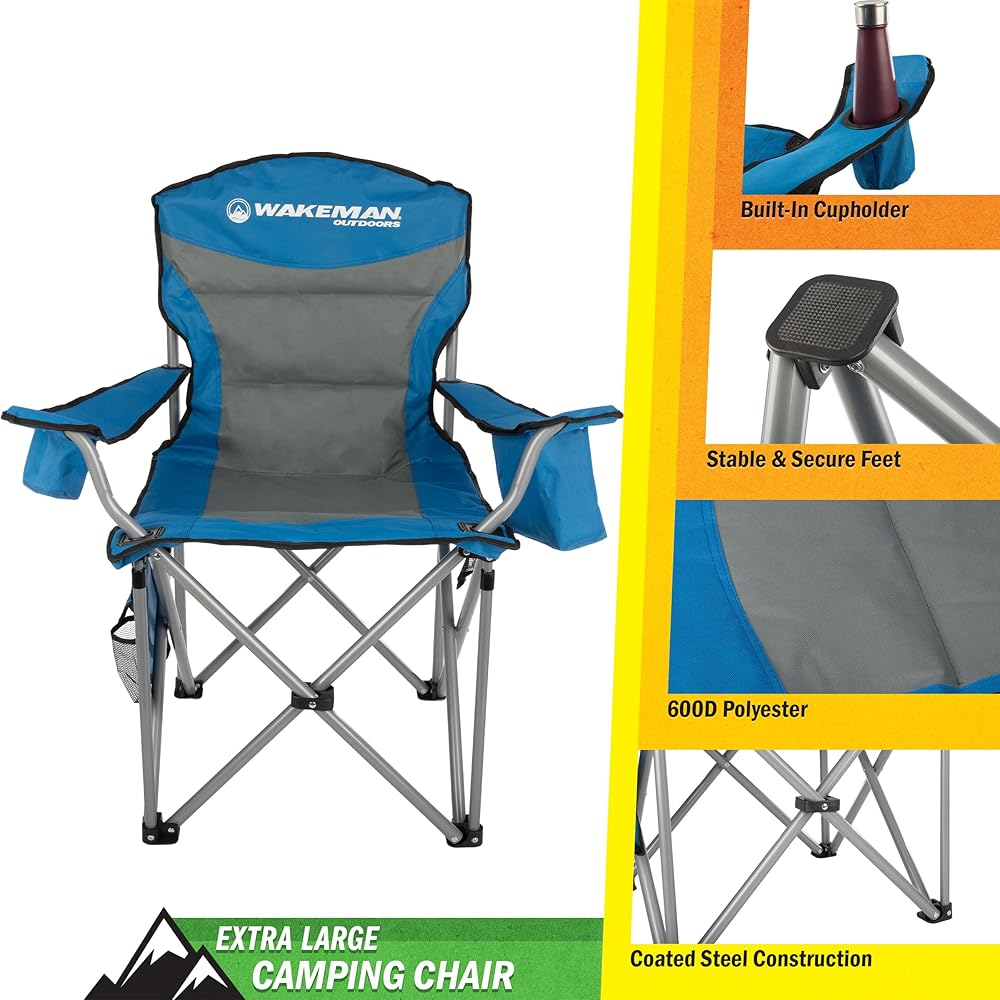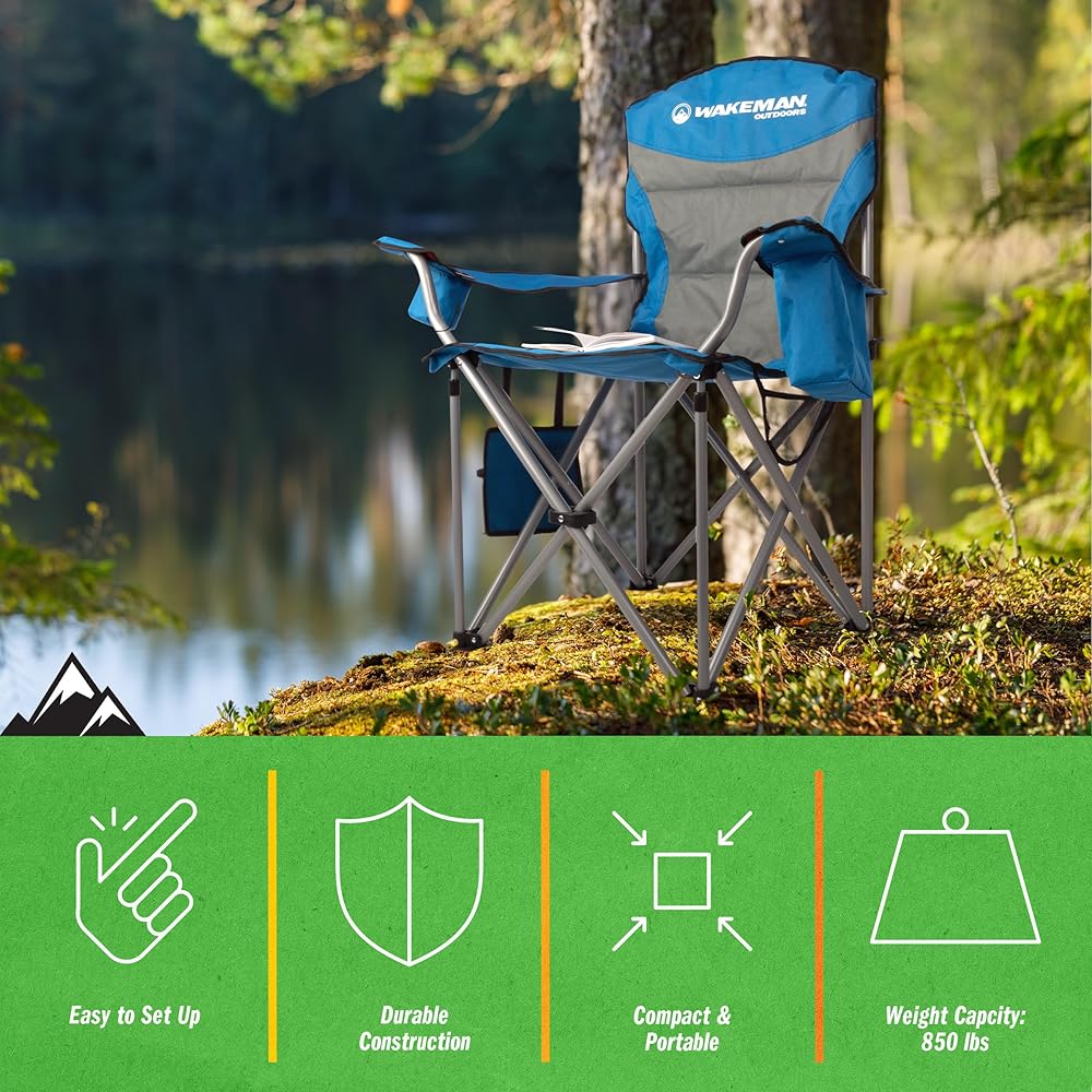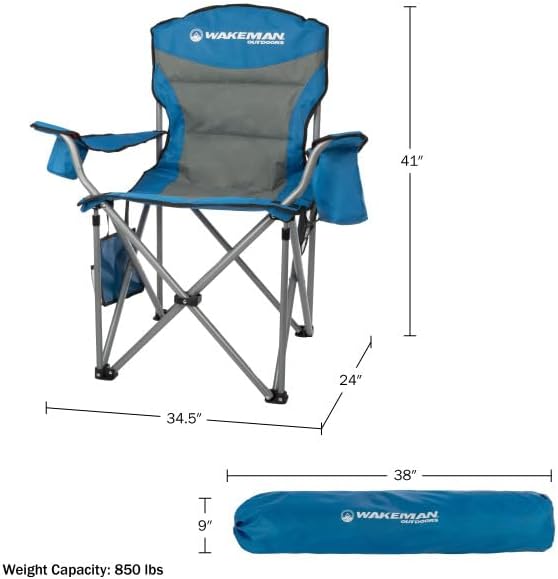 Sit comfortably wherever adventure takes you with the Heavy-Duty Collapsible Chair by Wakeman Outdoors. This incredibly durable plus size beach chair has an 850lb weight capacity and adjustable armrest straps so anybody can sit with ease and comfort. The lawn chair features a cupholder on one arm and a cooler pouch on the other, a removable side pocket with 2 pouches that are perfect for storing your phone or keys, and a mesh pocket on the back that's great for magazines or snacks. With a convenient carrying bag included, this oversized outdoor chair is ultra-portable, travel-friendly, and perfect for tailgating, camping, fishing, beach trips, sporting events, backyard cookouts, bonfires, and more. IMPORTANT: Wakeman Outdoors is committed to providing the consumer with the absolute best price and value on our entire line of products. NOTE: This is an exclusive product of Wakeman Outdoors and ONLY Camping Chairs for Adults Heavy Duty by Wakeman Outdoors are GUARANTEED to be genuine. Avoid buying counterfeit products and transacting with unauthorized sellers.