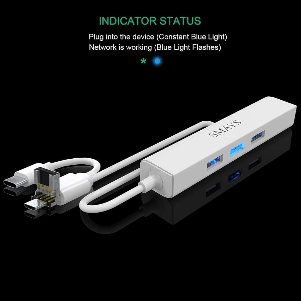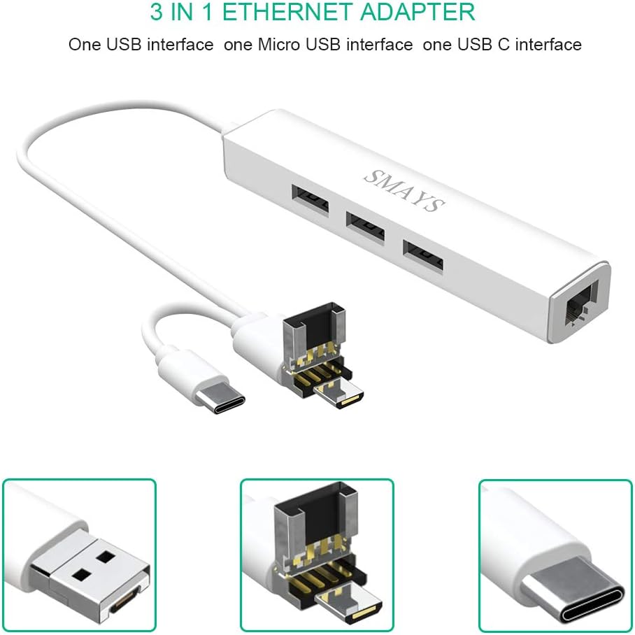 الكل في 1 - 3 واجهات مختلفة (قابس USB C/USB 2.0/Micro USB)، 1 منفذ RJ45 LAN، 3 مراكز بيانات USB 2.0 (محول كابل OTG)