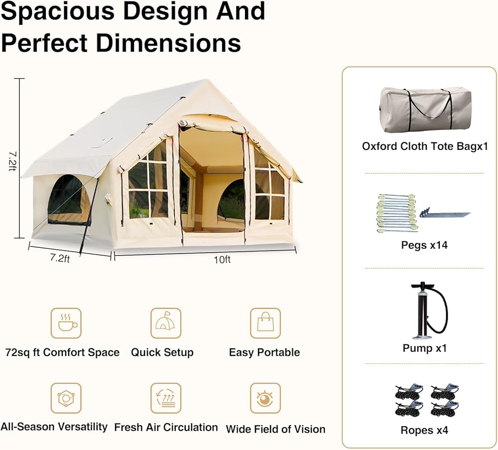 يتم إعدادها في 5 دقائق دون أي متاعب: قل وداعًا لمتاعب إعداد الخيمة التقليدية! يمكن نفخ خيمتنا الرائعة القابلة للنفخ بسهولة في دقائق معدودة باستخدام مضخة الهواء المتضمنة، فلا داعي للقلق بشأن فقدان الأجزاء أو تلفها