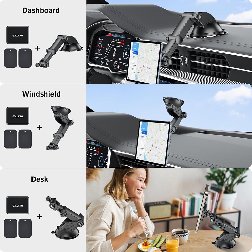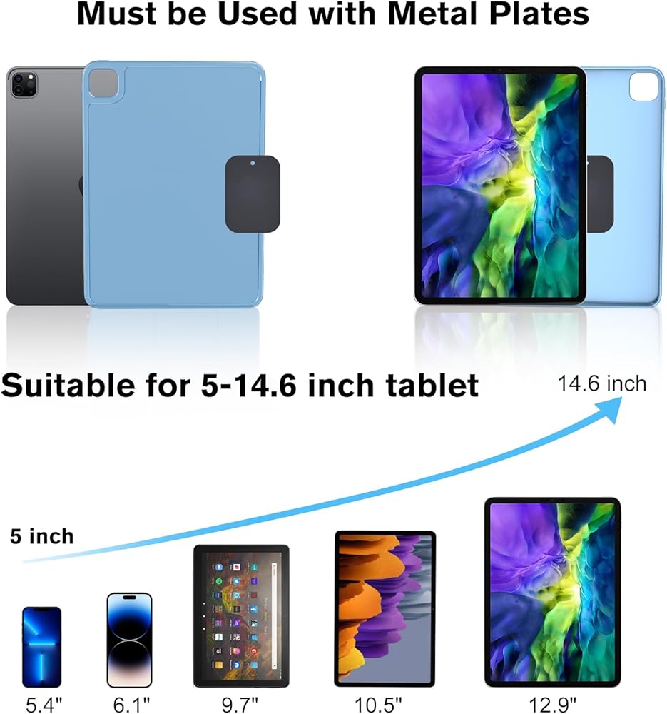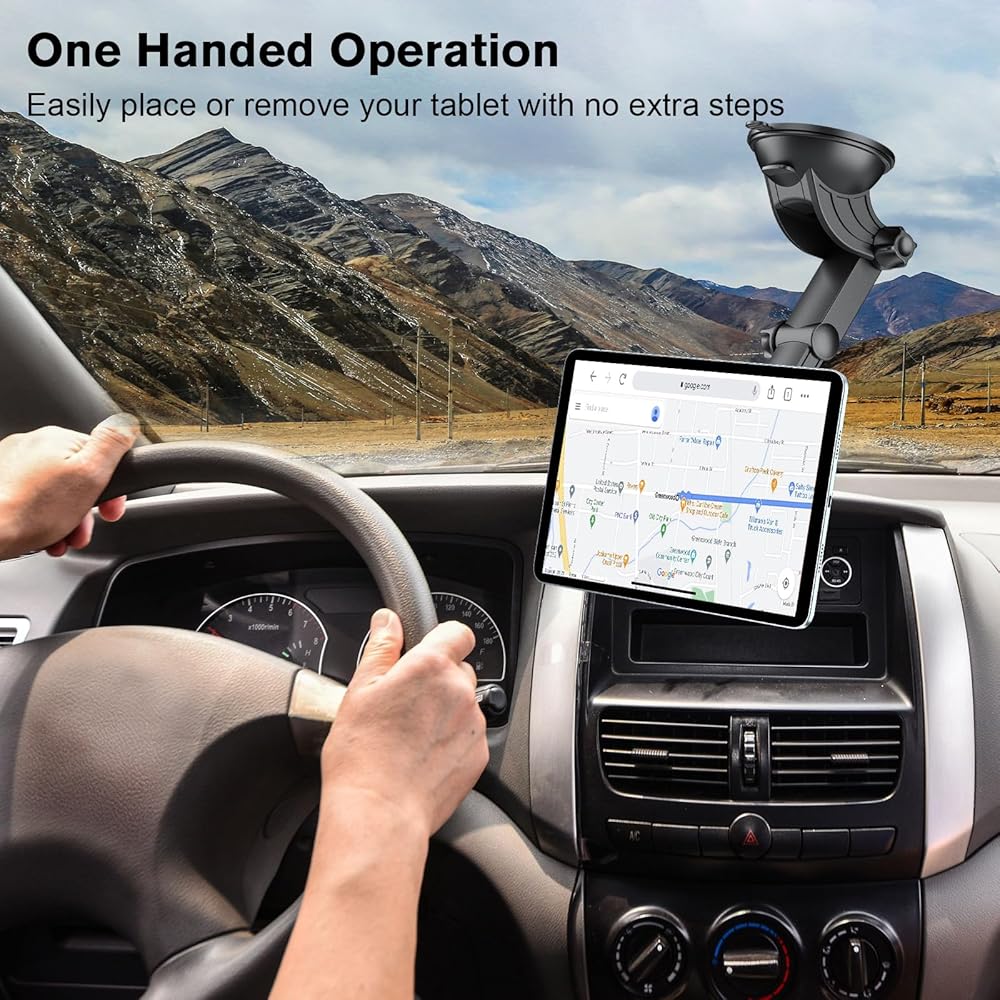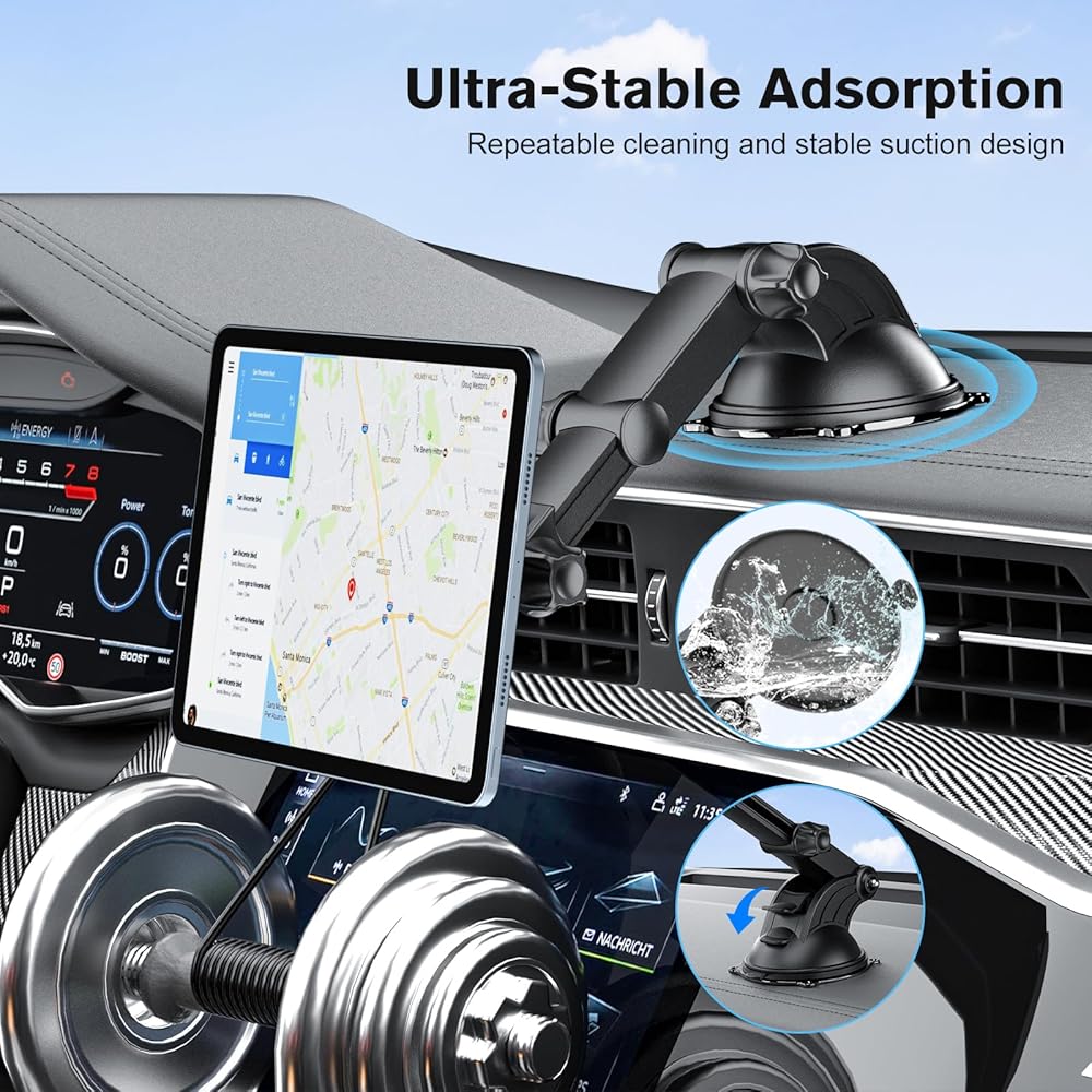 • Universal Compatibility: tablet holder for car dashboard fits on the back of any tablet and smartphone, such as iPad/Samsung Tab/Android/iPhone/Fire tablet/kindle, etc. [Note: The attached magnet piece must be attached when using]