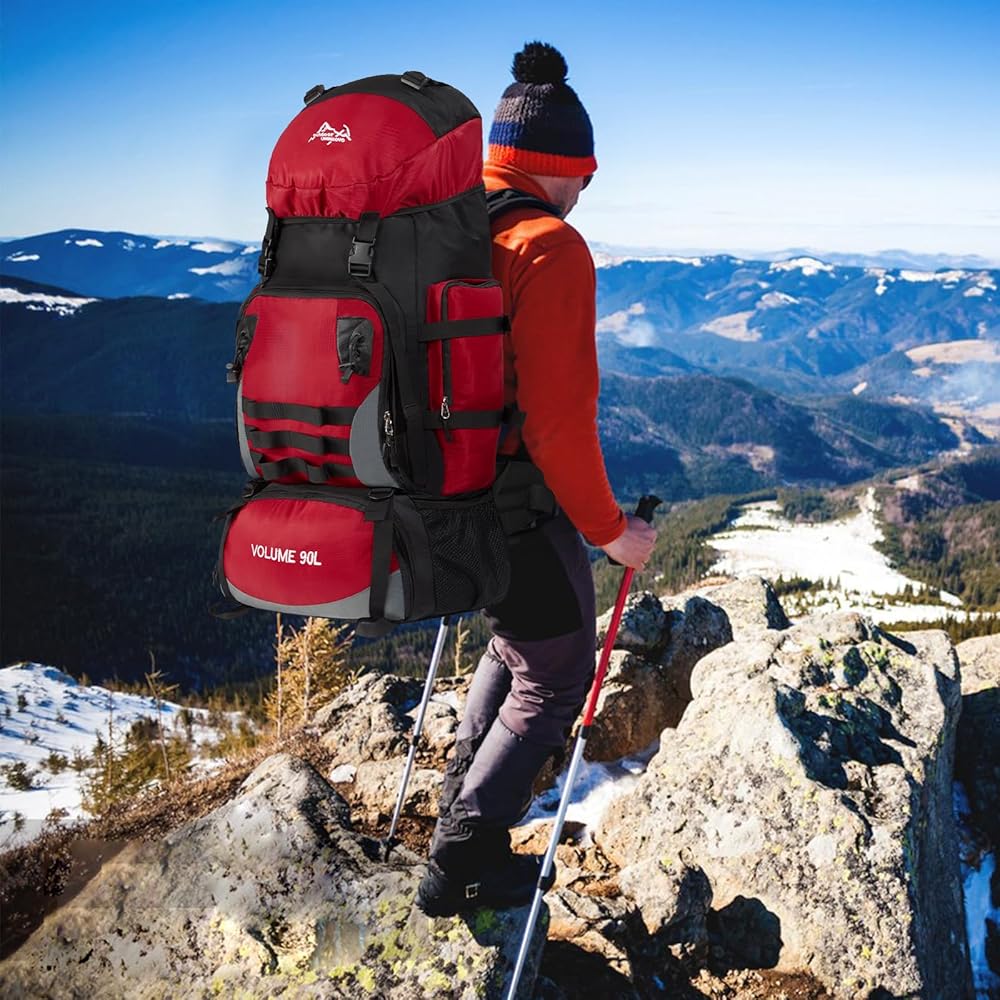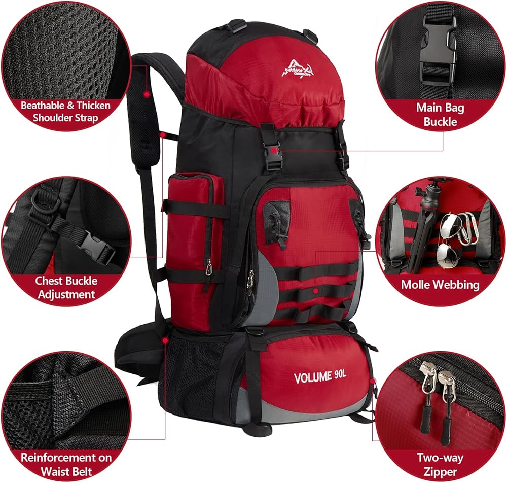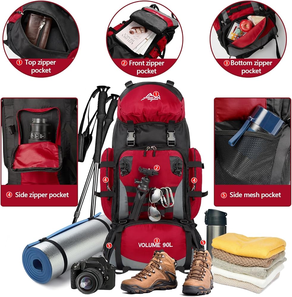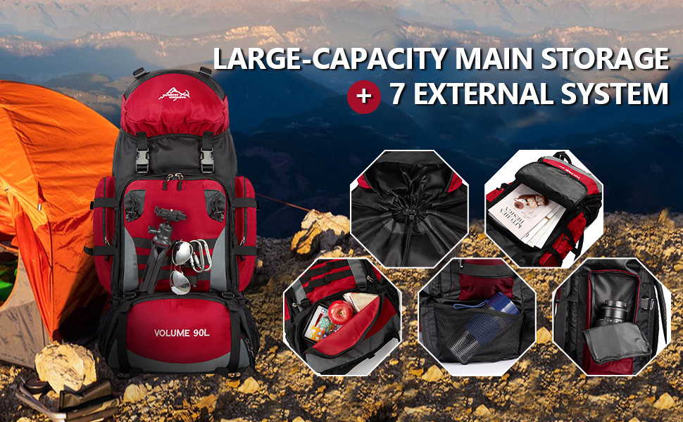 【هيكل حقيبة الظهر للمشي لمسافات طويلة】: الجيب الرئيسي لحقيبة الظهر للتخييم بسعة 90 لتر مغلق برباط، وحقيبة الظهر للمشي لمسافات طويلة واسعة بما يكفي لتخزين معدات التنزه سيرًا على الأقدام والملابس والأمتعة، وجيب سفلي بسحاب يمكنه تخزين الأحذية بشكل منفصل عن الملابس في الجيب الرئيسي. جيبان شبكيان جانبيان مناسبان لوضع الأكواب والمظلات. تحتوي حقيبة الظهر هذه لتسلق الجبال على جيب أمامي بسحاب وجيبين جانبيين للتخزين المنفصل والمنظم.