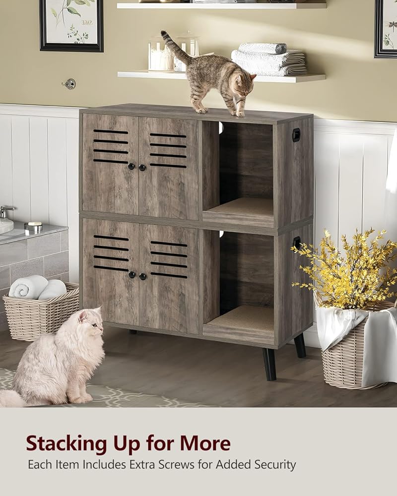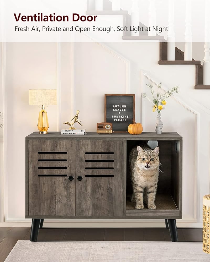 تصميم مدروس وحجم مثالي: مقبض وأرجل صندوق الفضلات المخفي آمنة للقطط لأنها لا تحتوي على حواف حادة. تتوفر ثلاثة ألوان لتناسب معظم أنماط المنزل. الحجم الداخلي لحمام القطط: 19.3 طول × 17.7 عرض، مناسب لمعظم صناديق الفضلات
