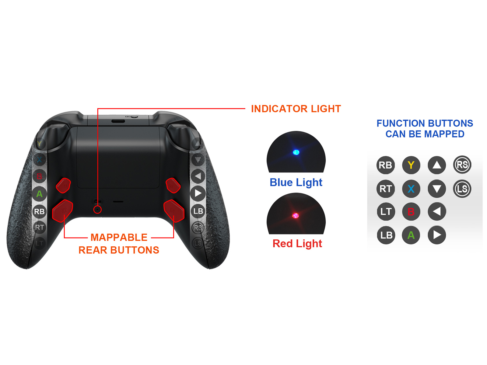 • يمكنك تفعيل برنامج إعادة رسم الخرائط أثناء اللعبة وتعيين 14 زرًا كحد أقصى (تشمل خيارات التعيين المتاحة: A، B، X، Y، R3، L3، UP، DOWN، LEFT، RIGHT، LB، RB، LT، RT) إلى الأزرار الخلفية.