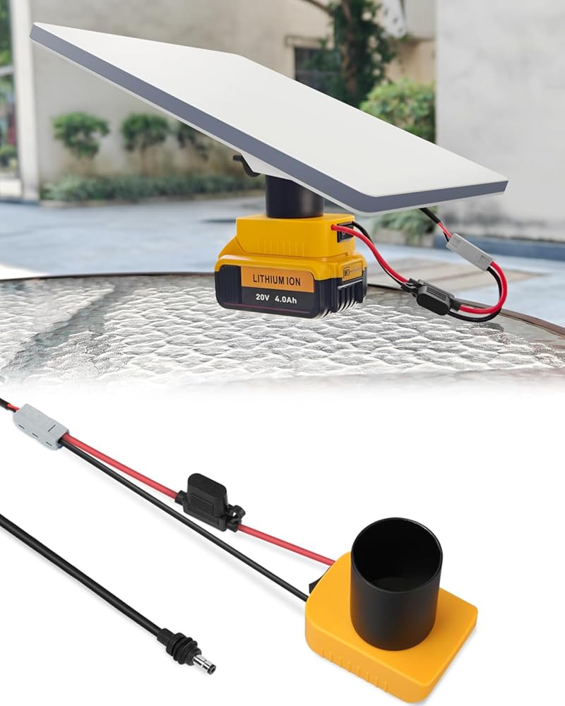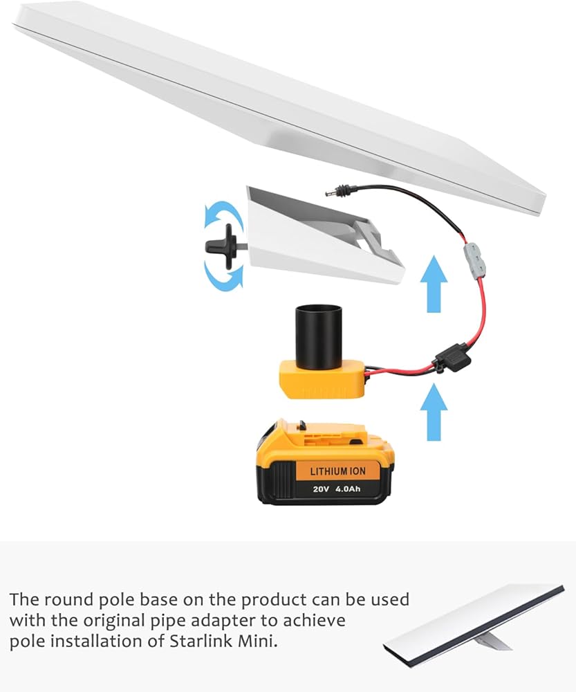 This Starlink MINI DC power cable compatible with Dewalt batteries is an ideal choice for you to power the Starlink Mini antenna in outdoor or mobile environments. The included 6 30A fuses and round pole adapter allow you to achieve pole-mounted installation to ensure better signal reception and device safety. Easy connection, no complicated settings, so you can enjoy high-speed Internet at any time