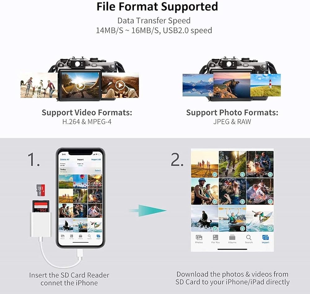 Connect the sd to iphone 15 adapter directly, download photos/videos to your iPhone/iPad and share them with your family and friends in real time. Ideal for photography enthusiasts.