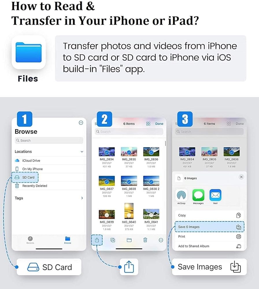 Supports one-way transmission from SD/Micro SD to the iOS Device via iOS Photos APP.