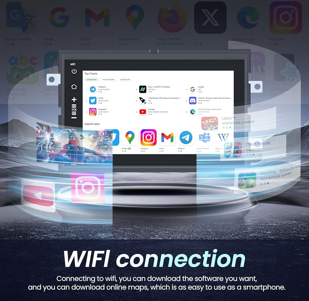 【واي فاي وبلوتوث 5.0】يمكنك مزامنة هاتفك الذكي بسهولة مع راديو السيارة عبر البلوتوث، مما يتيح لك بث الموسيقى المفضلة لديك، والتنقل في الطرق، والمشاركة في المحادثات الهاتفية، والمزيد، كل ذلك بدون استخدام اليدين. وداعًا للمخاوف المتعلقة بفقدان التحديثات المهمة، أو ضياع طريقك، أو الرتابة أثناء القيادة. ارفع مستوى استمتاعك بالقيادة ليس فقط من خلال الوصول إلى الميزات المذكورة ولكن أيضًا عن طريق تنزيل عدد لا يحصى من التطبيقات لتصفح الويب عند توصيل راديو السيارة بشبكة WiFi أو نقطة اتصال.