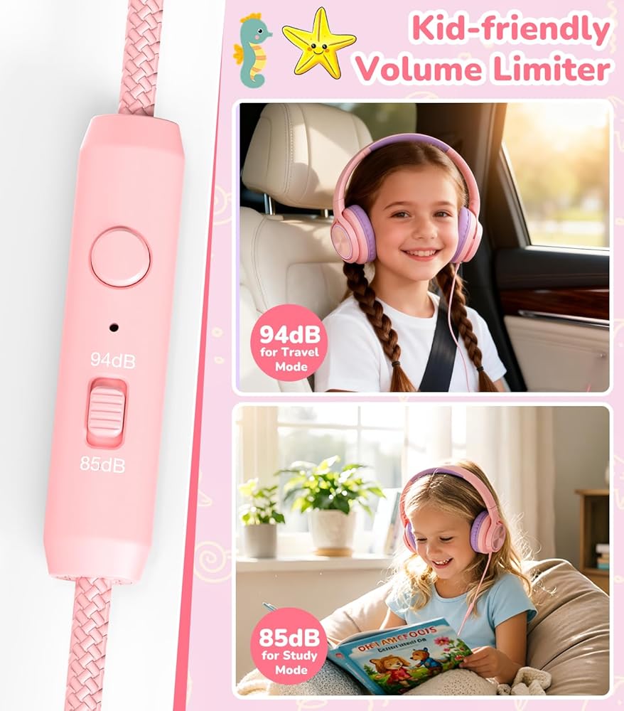 【تحكم آمن في مستوى الصوت بنسبة 85/94 ديسيبل】 آذان الأطفال حساسة للأصوات العالية ولا تريد أن يرفعوا مستوى الصوت ويدمروا سمعهم! لذلك، تم تصميم هذه السماعة خصيصًا للأطفال. تحدد سماعات الرأس مستوى الصوت إلى 85 ديسيبل للاستخدام اليومي، ويمكن أن تصل أيضًا إلى 94 ديسيبل لضمان سماع طفلك صوتًا واضحًا تمامًا في البيئات الصاخبة مثل السيارات أو الطائرات.