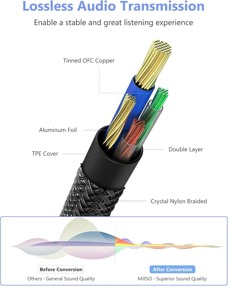 جزء خارجي متين وناعم: وصلة 4 دبابيس 3.5 مم تعتمد هيكل قولبة متكامل وهيكل معدني باللون الأزرق البحري (تصميم "رقبة الزجاجة")، مما يتيح لك إدخال وإزالة امتداد MillSO 3.5 بشكل أسهل. كابل TPE الناعم مغلف بطبقة من النايلون المجدول القوي والمتين، والذي لا يطيل عمر الخدمة فحسب، بل يتمتع أيضًا بمرونة ممتازة وخالية من التشابك.