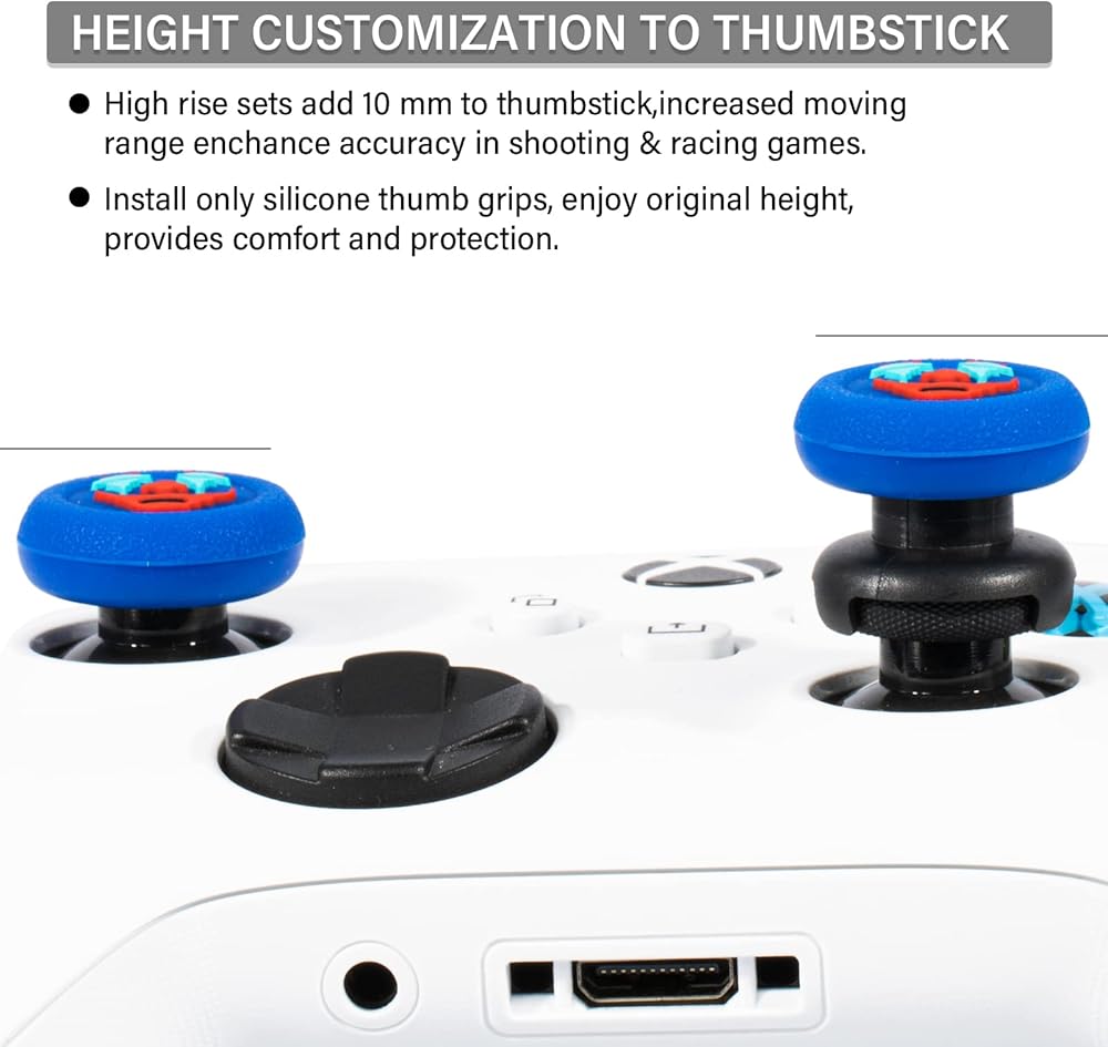 • خيارات ارتفاع مختلفة - تضيف مجموعات الموسع والمقابض ارتفاعًا 10 مم إلى العصا، وتعزز الدقة في ألعاب الرماية والسباق. قم بتركيب مقابض الإبهام المصنوعة من السيليكون فقط، واستمتع بالارتفاع الأصلي والراحة والحماية المثالية؛