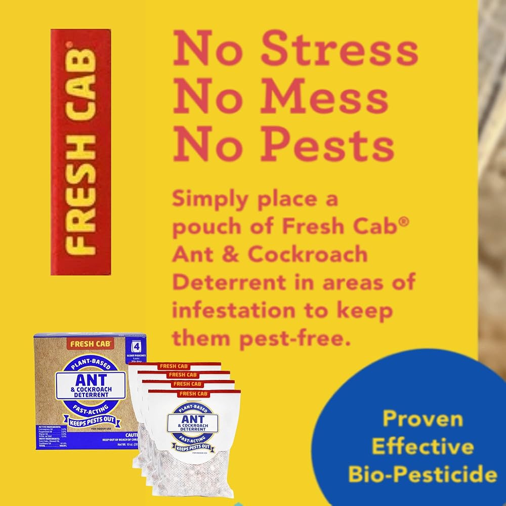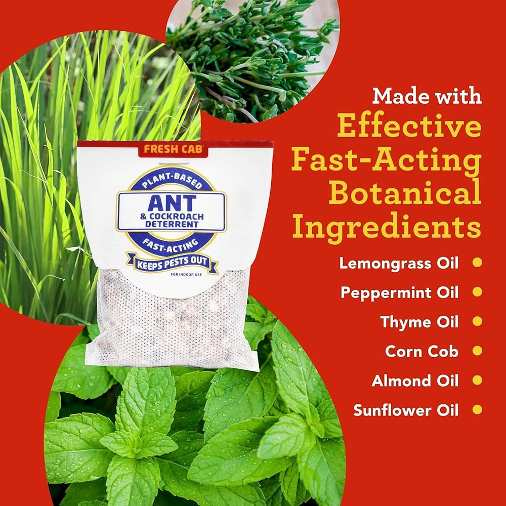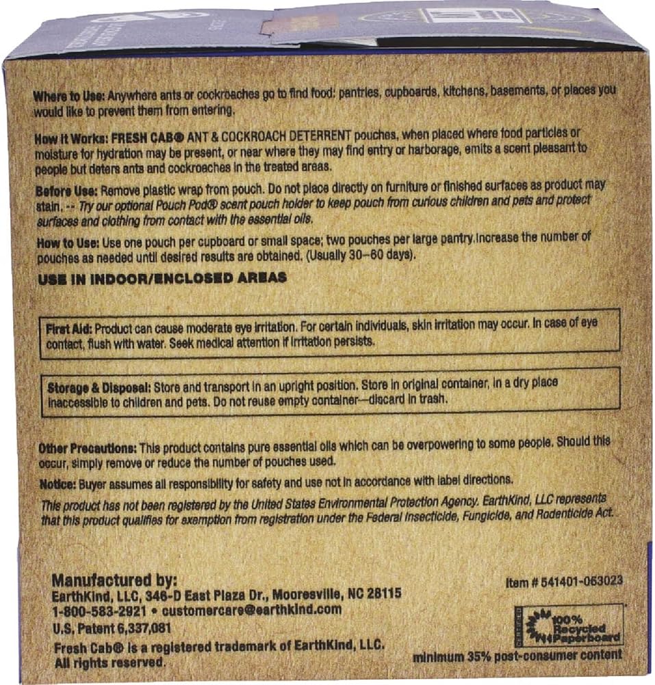 EarthKind presents a naturally smarter, plant-based ant and cockroach deterrent that offers efficient pest control without the use of harmful chemicals. This product is a swift, effective answer to your ant and cockroach problem, designed specifically for enclosed spaces where these pests tend to hide, such as storage areas, garages, tractors, boats, and RVs. Our deterrent is made with lemongrass oil, peppermint oil, and thyme oil. These natural ingredients make it safe to use around your family, including kids and pets, when used as directed. Unlike other pest control methods, our product deters ants and cockroaches without killing them, preserving nature's ecosystem. EarthKind is proud to offer a naturally smarter ant and cockroach deterrent to poisons and traps. These pouches are effective and easy to use. Simply remove the outer plastic wrapper and place the pouch in areas to keep free of pests. Whether it's the garage, a vehicle, or a storage area, the pouches can be set in areas with existing pest activity or to prevent future infestations. Each pouch provides continuous protection for 30 days, ensuring your house stays ant and cockroach free. EarthKind backs its products with a 100% money-back guarantee. Choose Fresh Cab Ant and Cockroach Deterrent for a worry- and mess-free deterrent. EarthKind is on a mission to make every home a pest-free zone by providing cruelty-free, botanical pest repellent solutions. We create plant-based solutions for keeping pests out of your home without killing or poisoning them, because we believe in working with nature, not against it.