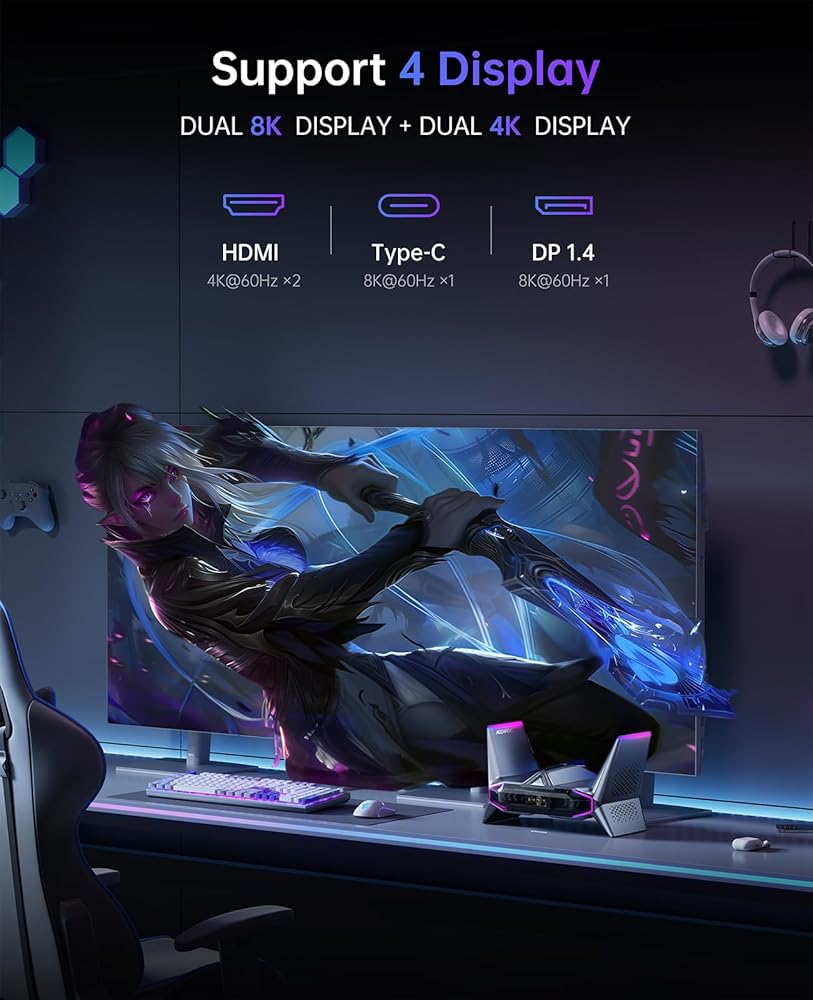 ◀【𝐅𝐨𝐮𝐫 𝐒𝐜𝐫𝐞𝐞𝐧 𝐃𝐢𝐬𝐩𝐥𝐚𝐲 & WiFi6 & BT5.2】 تدعم ألعاب الكمبيوتر الصغير أربع شاشات عرض (Dual HMDI2.0+Type-C+DP1.4)، USB 4 Type-C وتدعم واجهات DP1.4 جودة صورة مفصلة بدقة 8K@60 هرتز. منافذ LAN مدمجة بسرعة 2.5 جيجابت في الثانية، وWiFi 6، وBluetooth 5.2، يأتي الكمبيوتر المكتبي مزودًا بمجموعة من الأجهزة المتطورة لإبقائك على اتصال. 3*منافذ USB 3.2 Gen2 Type-A تدعم نقل البيانات بسرعة 10 جيجابت في الثانية، 3*منافذ USB3.2 Gen1 Type-A بسرعة تصل إلى 5 جيجابت في الثانية.