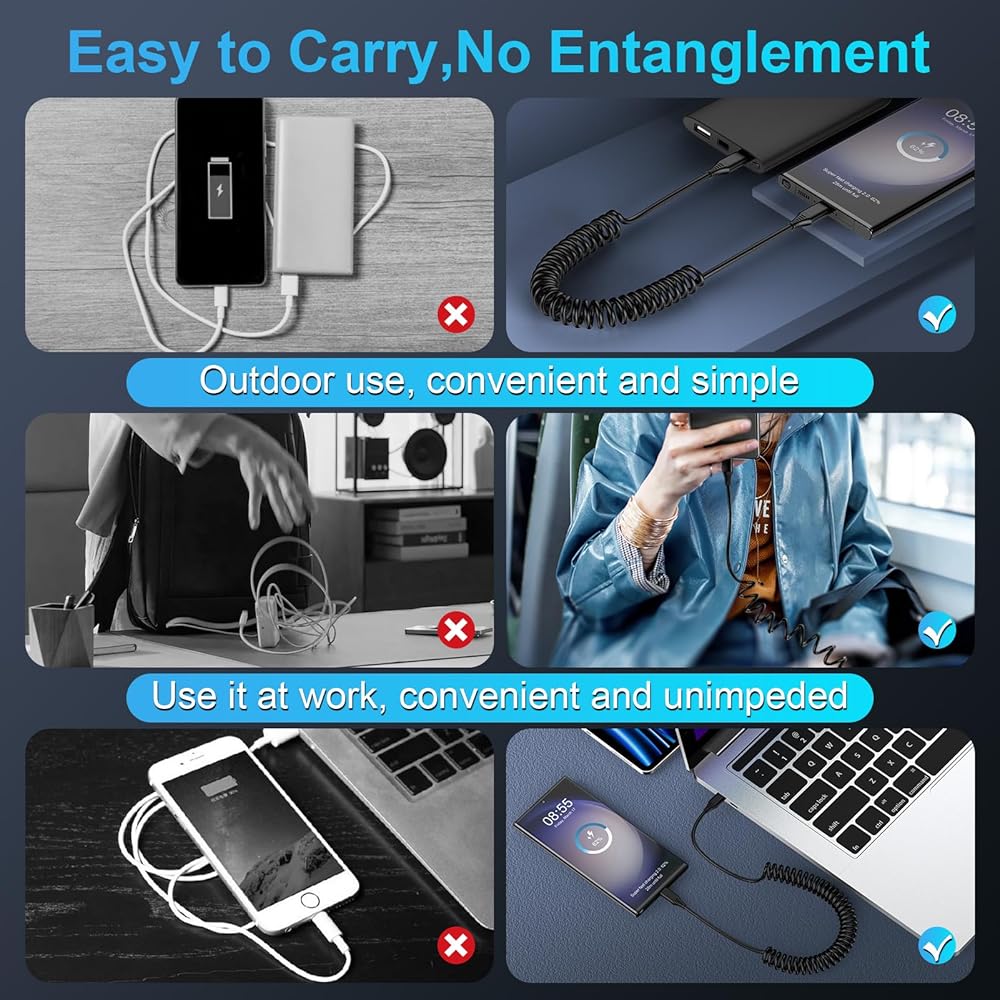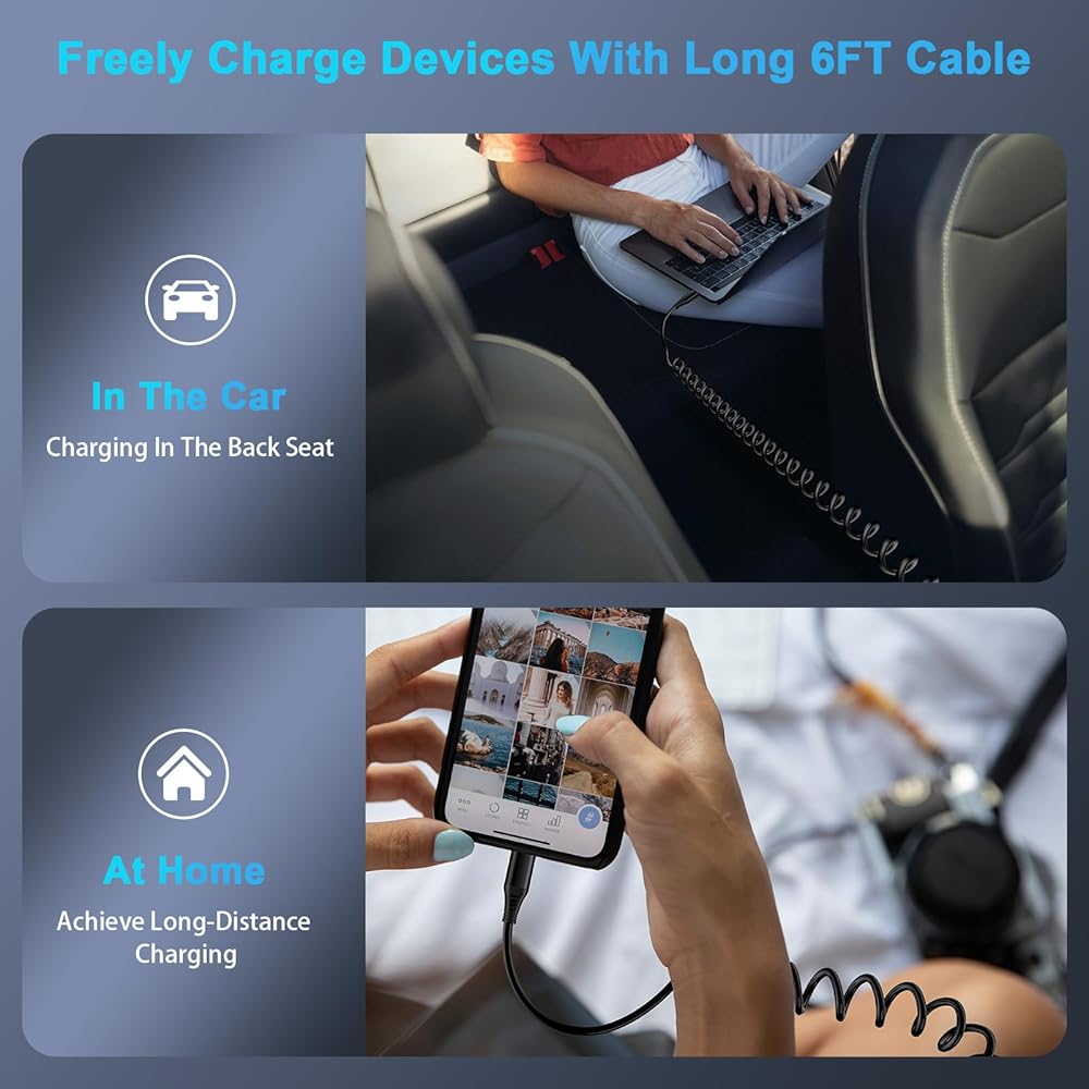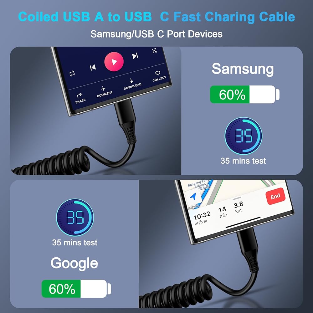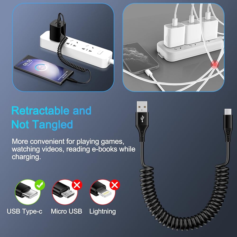 -USB c to c cable coiled is the perfect solution for charging your phone in the car. Coiled charging cord keeps the interior of the car clean and tidy.