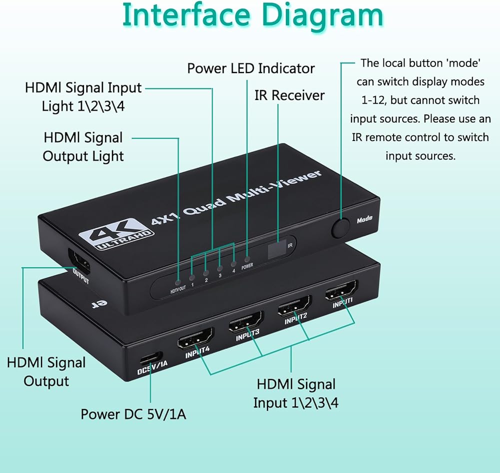 HDMI Multiviewer Switch 4x1 تبديل سلس رباعي متعدد المشاهد 4 في 1 محول خارجي مع جهاز تحكم عن بعد بالأشعة تحت الحمراء، يدعم 4k@30hz 1080P@60hz 9 أوضاع عرض لكاميرا الأمان وأجهزة الألعاب