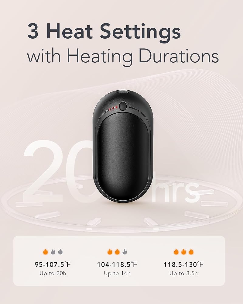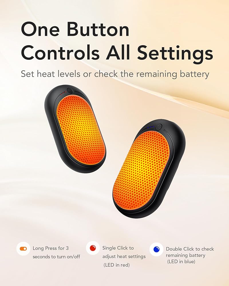 • حرارة تدوم طويلاً: مدعوم ببطارية عالية السعة قابلة لإعادة الشحن، يوفر جهاز تدفئة اليد الكهربائي هذا ما يصل إلى 10 ساعات من الحرارة المتسقة بشحنة واحدة، وهو مثالي للخروج لفترة طويلة أو الاستخدام طوال اليوم في المكتب.