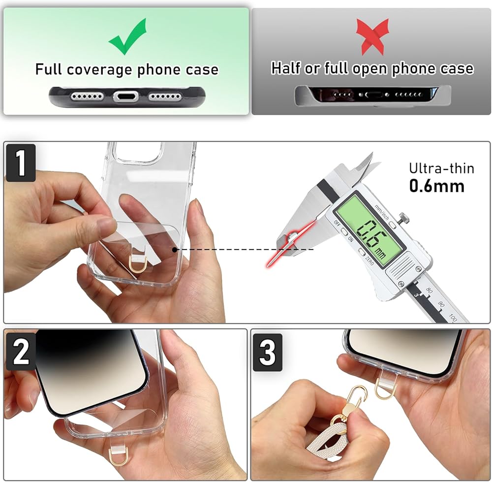Easy to install and does not affect charging: Pass the clear Phone lanyard tab through the charging hole of the phone case, attach the smartphone and the metal buckle with the phone lanyard to complete. The phone lanyard tab is only 0.6mm thin and does not affect the charging port or wireless charging or case fitting. There is no adhesive on the phone strap holder, and it can be used freely without leaving any marks inside any iphone case.