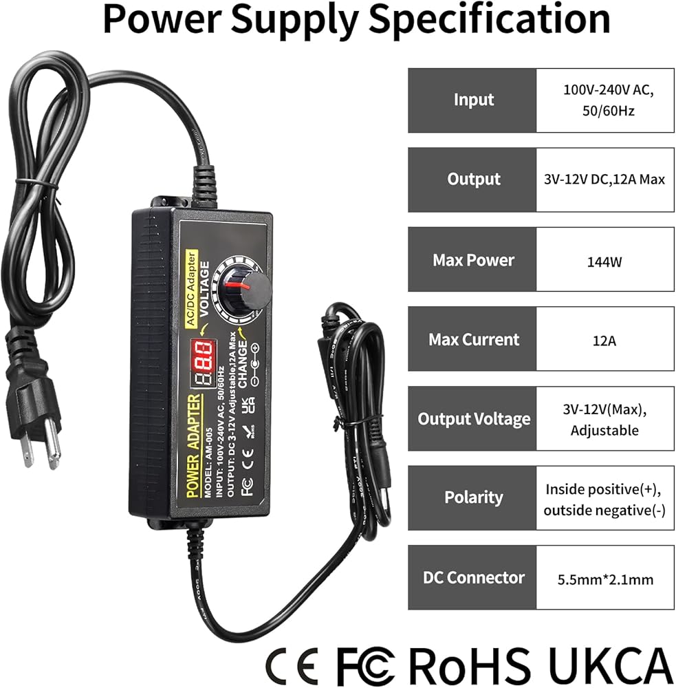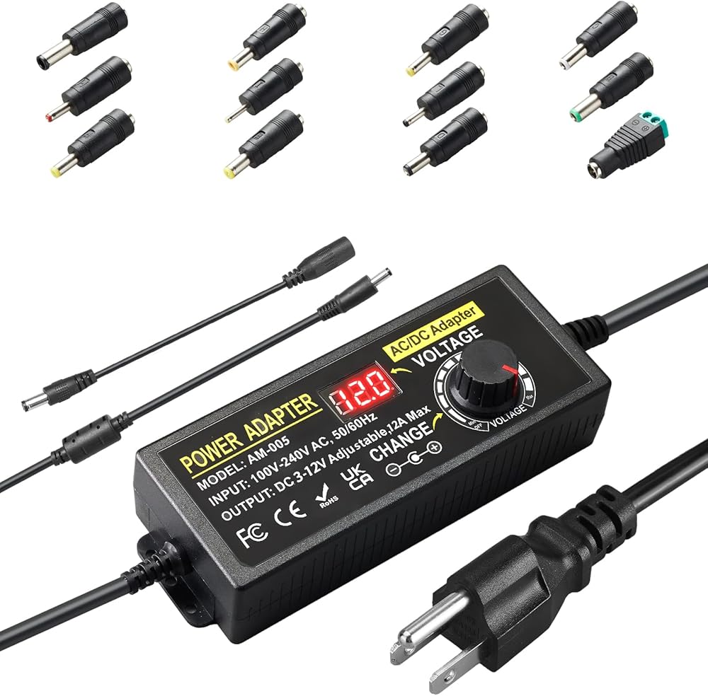 • مصدر طاقة قابل للتعديل - الإدخال: تيار متردد 100 ~ 240 فولت، 50/60 هرتز؛ الإخراج: تيار مستمر 9 ~ 36 فولت قابل للتعديل (مثل 9 فولت 10 فولت 12 فولت 14 فولت 15 فولت 19 فولت 20 فولت 21 فولت 23 فولت 24 فولت 26 فولت 28 فولت 30 فولت 32 فولت 34 فولت 36 فولت)، الطاقة القصوى 108 واط؛ متوافق مع الأجهزة ذات التيار أقل من 3 أمبير (مثل 200 مللي أمبير، 300 مللي أمبير، 500 مللي أمبير، 1 أمبير، 1.5 أمبير، 2 أمبير، 2.5 أمبير، 3 أمبير). وقطبية هذا المحول هي: داخل (+)، خارج (-).