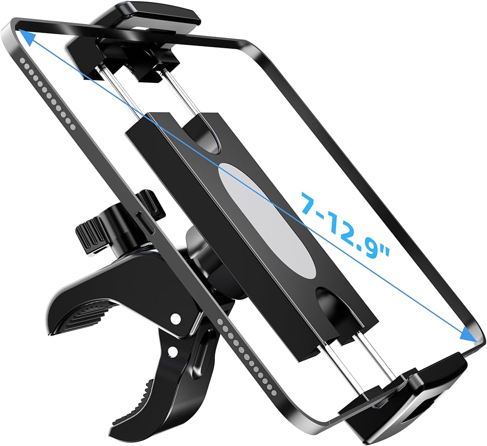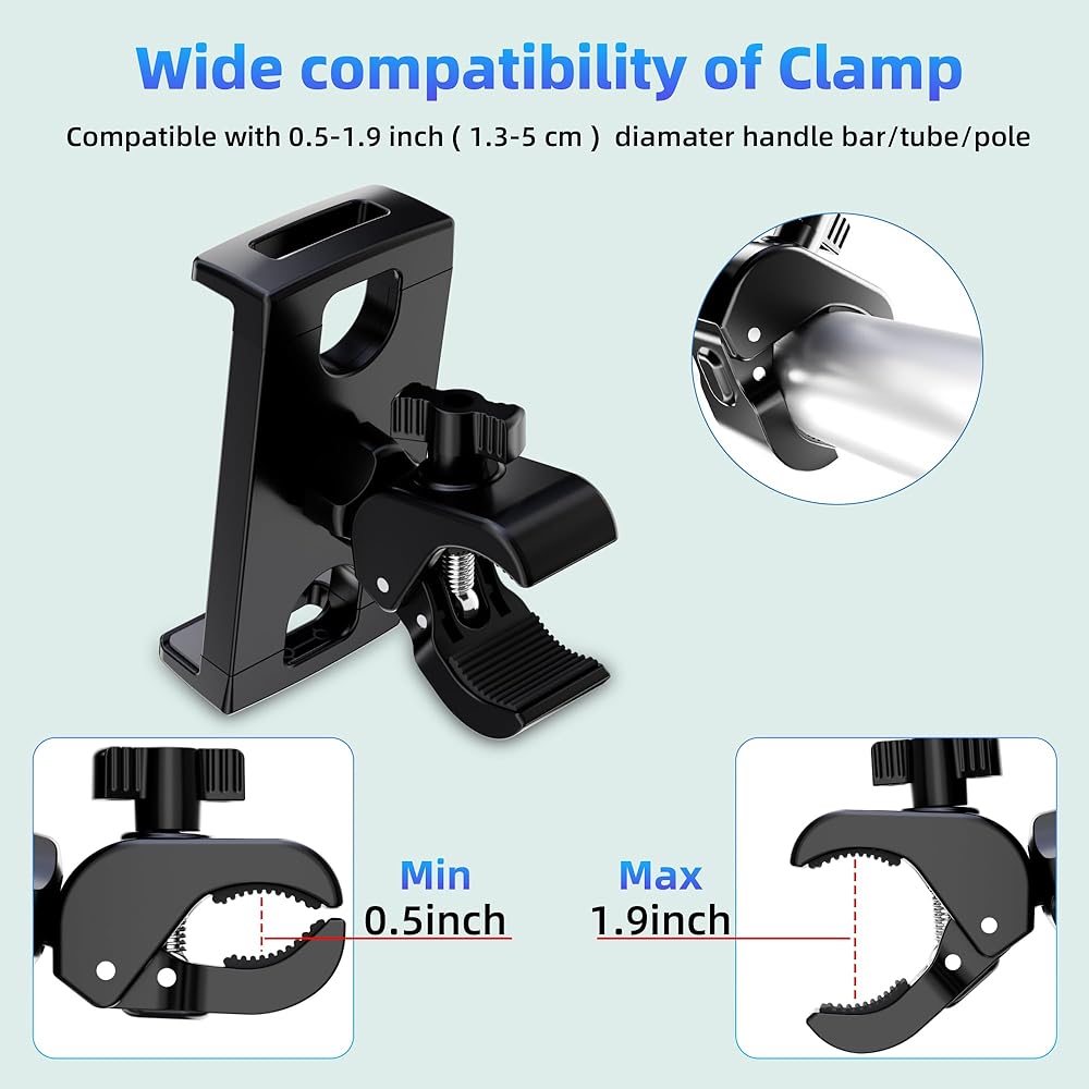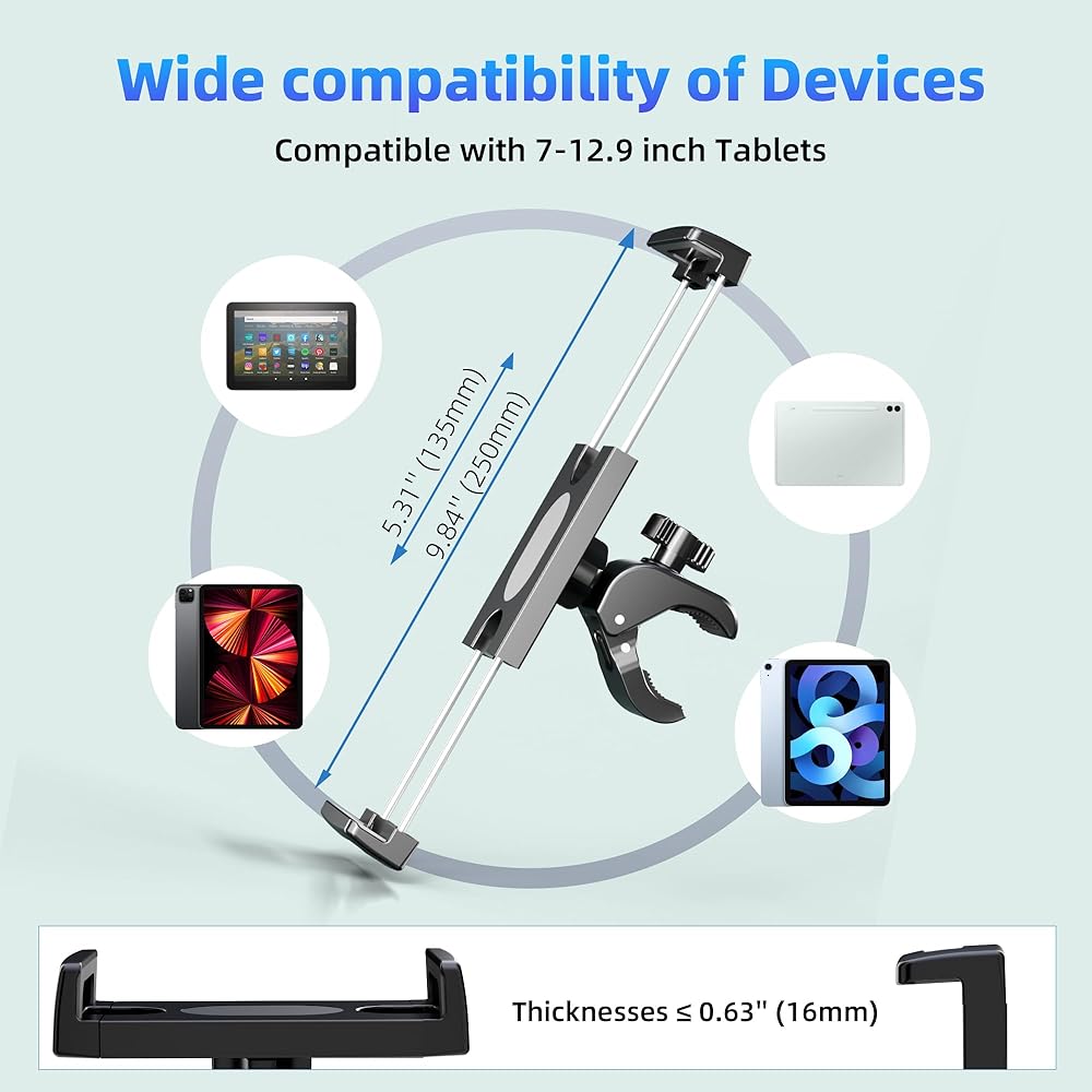 【سهلة الاستخدام】: لا توجد حاجة لأي أدوات لتثبيت حامل iPad! يتم تركيب المشبك القابل للتعديل بسهولة على أعمدة بقطر 0.5-1.9 بوصة (1.3-5 سم)، مما يجعله مثاليًا للدراجات الدوارة (مثل دراجة بيلوتون)، وأجهزة المشي، وعربات الأطفال، وعربات التسوق، وعربات الجولف، وحوامل الميكروفون، والمزيد. فقط قم بإعداده وانطلق!