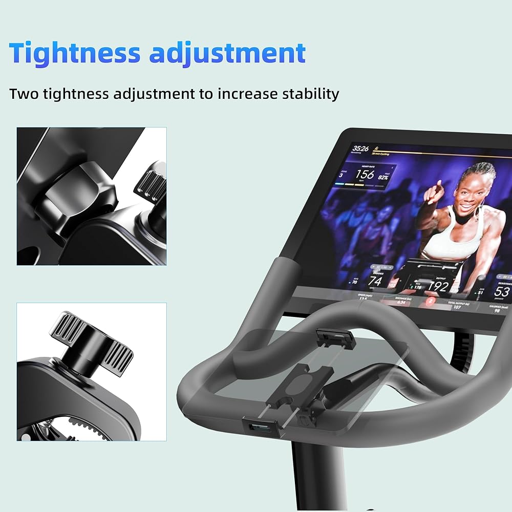 【مستقر وثابت】: يضمن حامل الجهاز اللوحي هذا أقصى قدر من الثبات. يحتوي المشبك على مقبض سيليكون غير قابل للانزلاق، ويتم تثبيته بشكل آمن على الأعمدة دون القلق بشأن الاهتزازات أو السقوط أثناء التمرين. مصممة للاستخدام الداخلي فقط - تجنب ركوب الدراجات في الهواء الطلق!