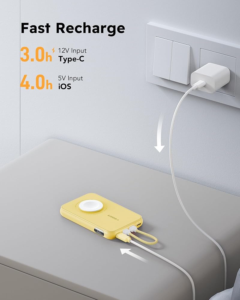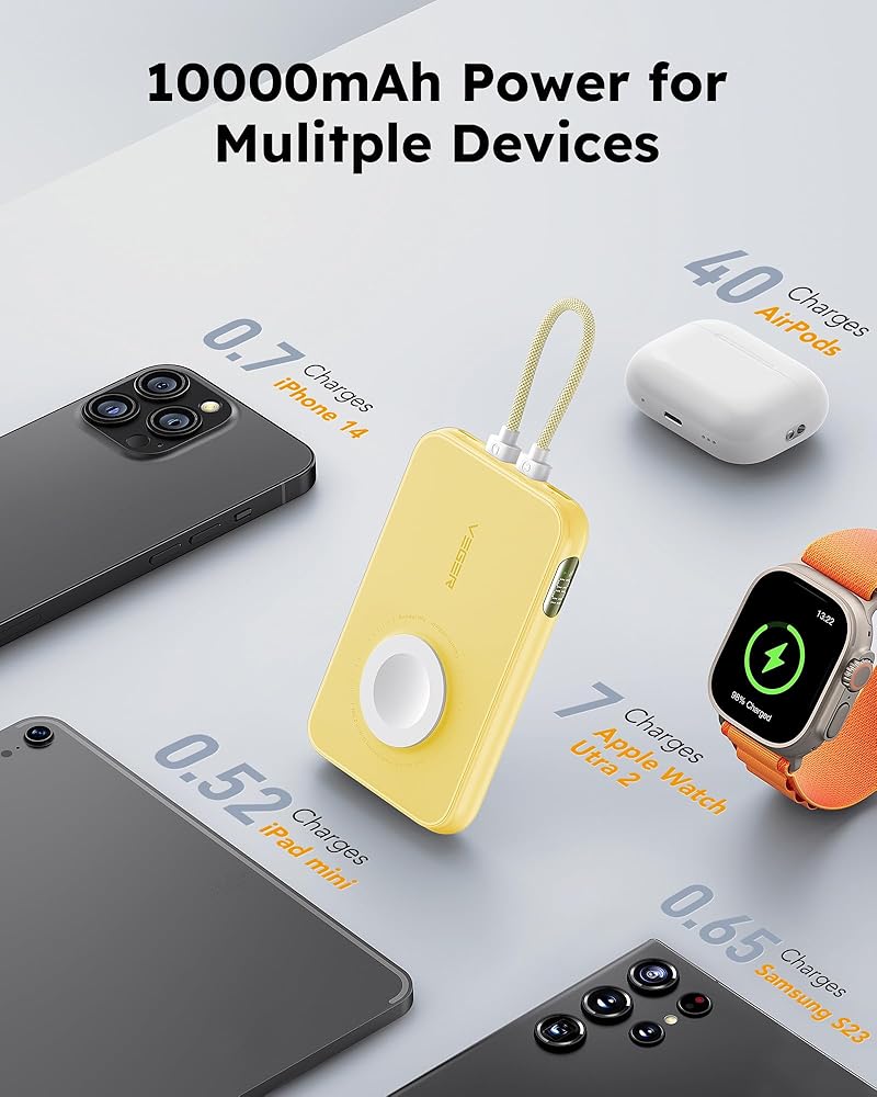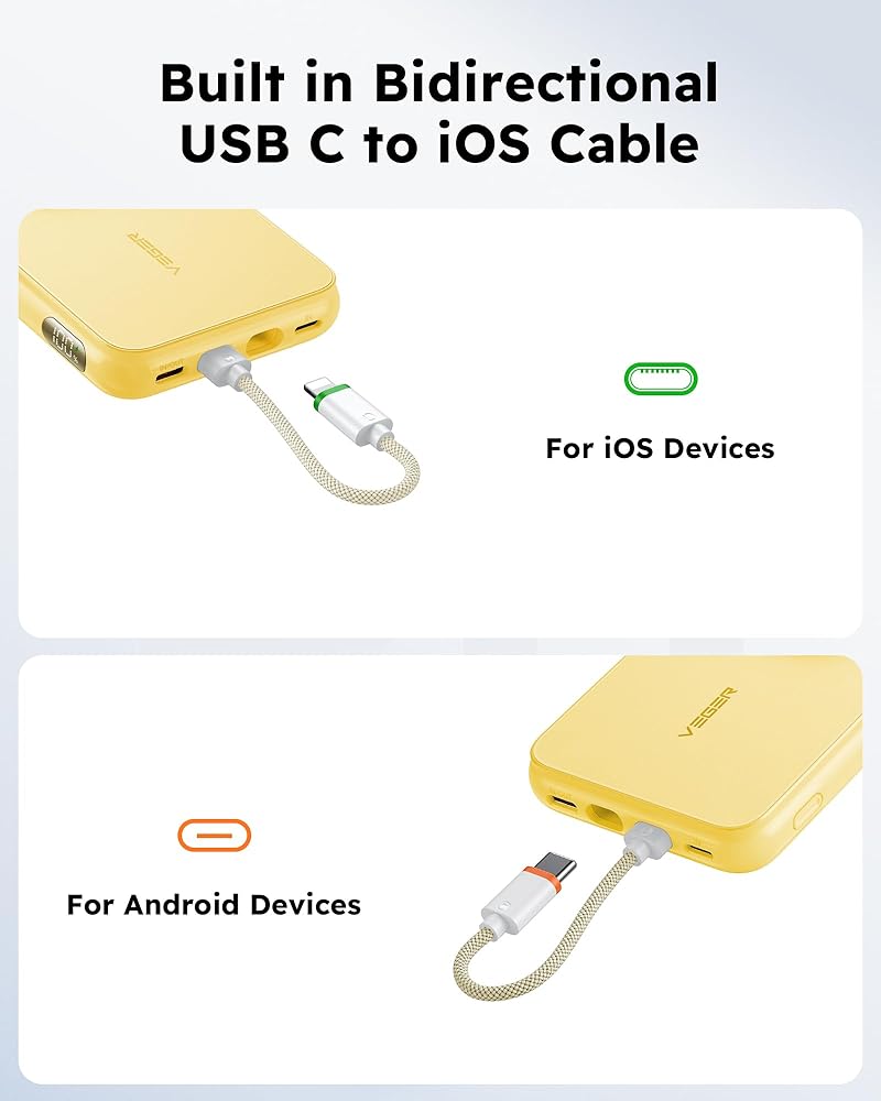 شاحن محمول VEGER مع كابل مدمج (قابل للإزالة)، حزمة بطارية بنك طاقة صغيرة 10000 مللي أمبير في الساعة، شاحن سريع PD 20 وات، ملحق سفر متوافق مع iPhone 15/14/13 Pro Max، Sumsang، Apple Watch - أصفر