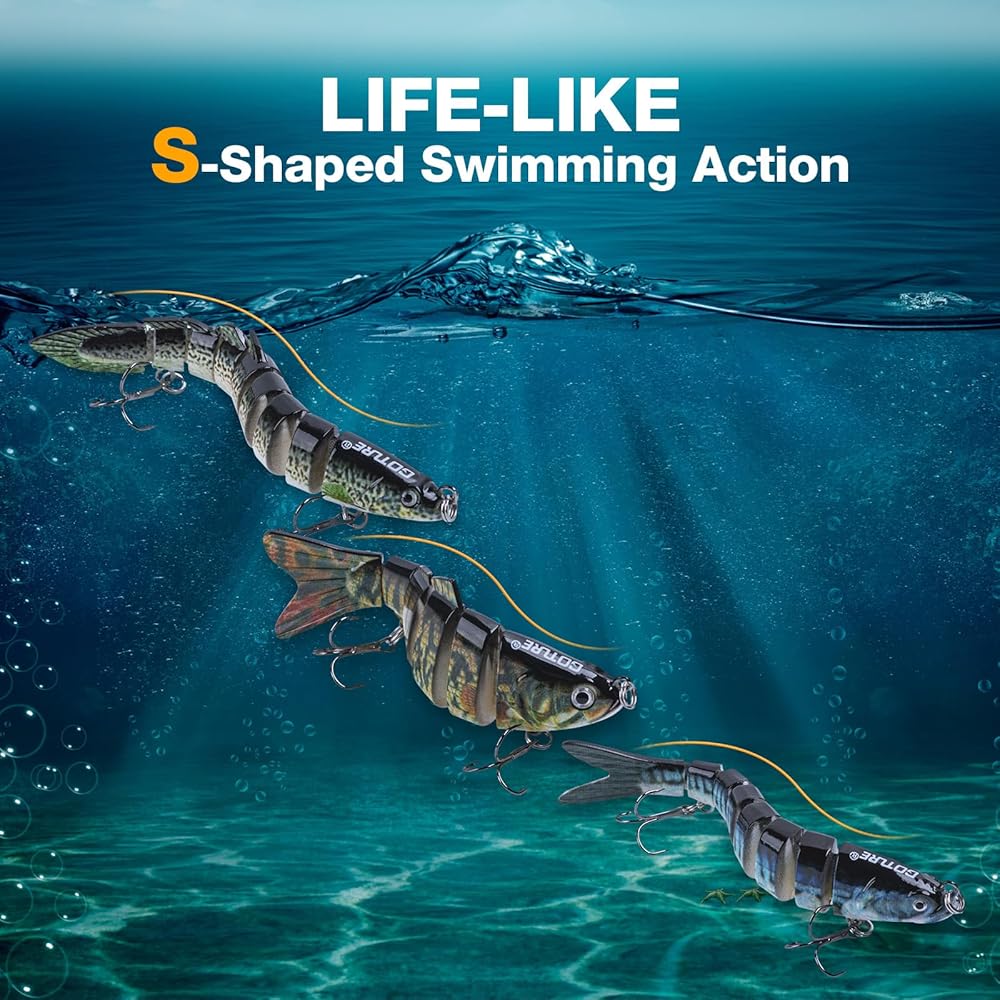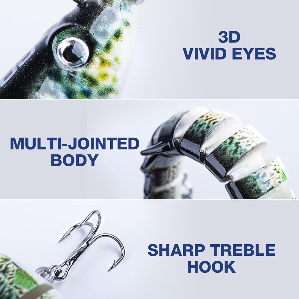 • طعوم واقعية متعددة المفاصل: تتميز طُعم السباحة بجسم بلاستيكي ABS متين معزز بنسيج شبكي متين. مكتملة بعيون ثلاثية الأبعاد تشبه الحياة وطلاء مسحوق اللؤلؤ، تعمل طُعم السباحة المفصلية هذه دون عناء على تحفيز غريزة المفترس الطبيعية لوحوش المياه العذبة أو المياه المالحة.