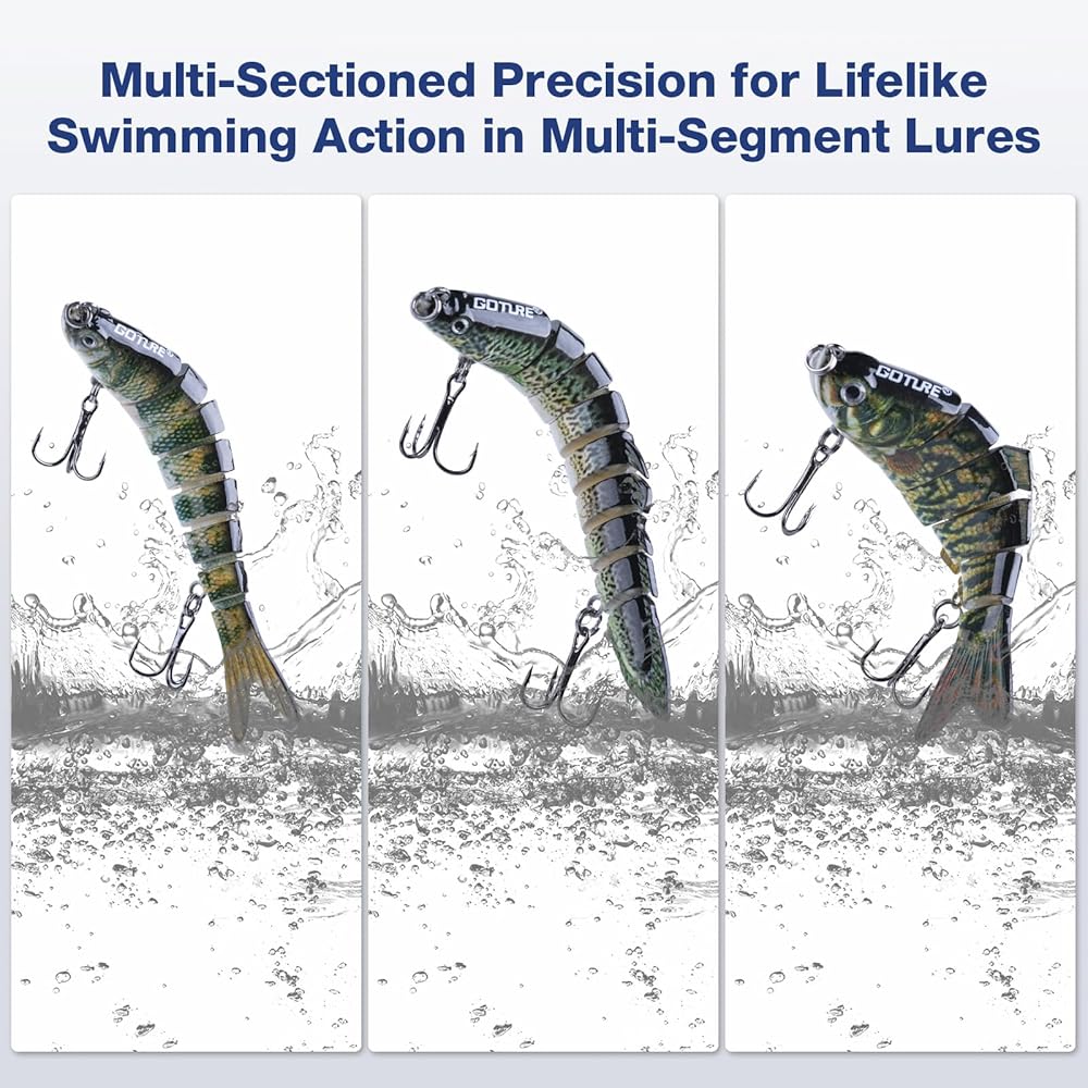 • حركة سباحة مفعمة بالحيوية: تم تصميم طُعم الصيد Goture bass بدقة مع أجسام متعددة المفاصل 6/8/9، مما يسمح لها بالغرق ببطء وتظهر حركة سباحة طبيعية على شكل حرف S. تحاكي هذه الطُعم الجهير حركة الأسماك الحقيقية، مما يجذب المزيد من الصيد ويغري الأسماك المفترسة بالضرب