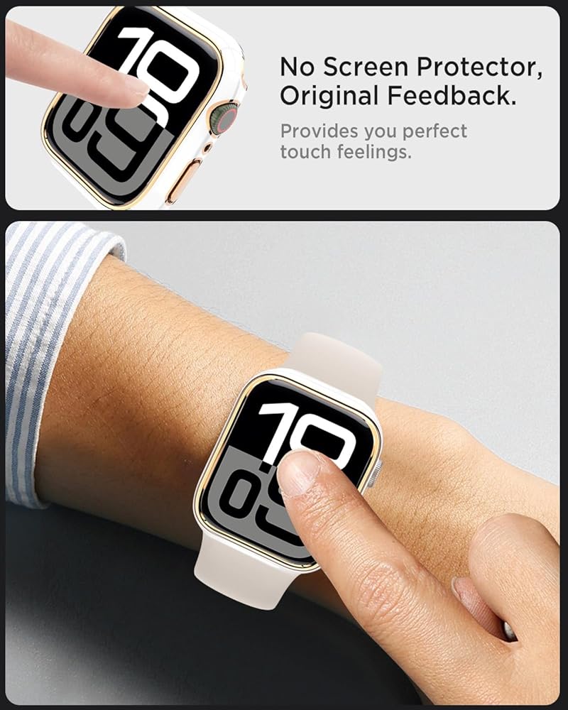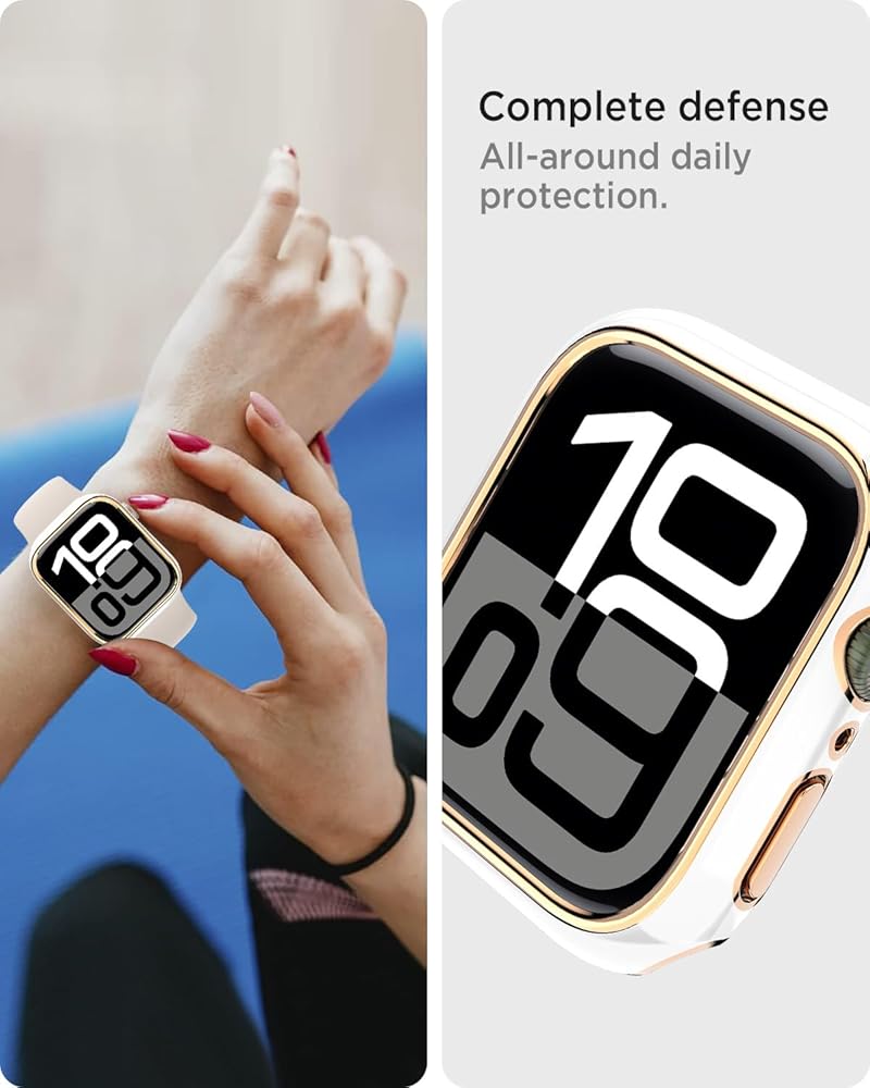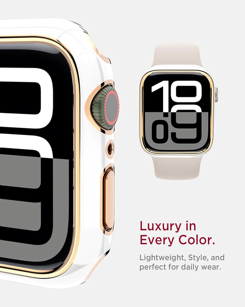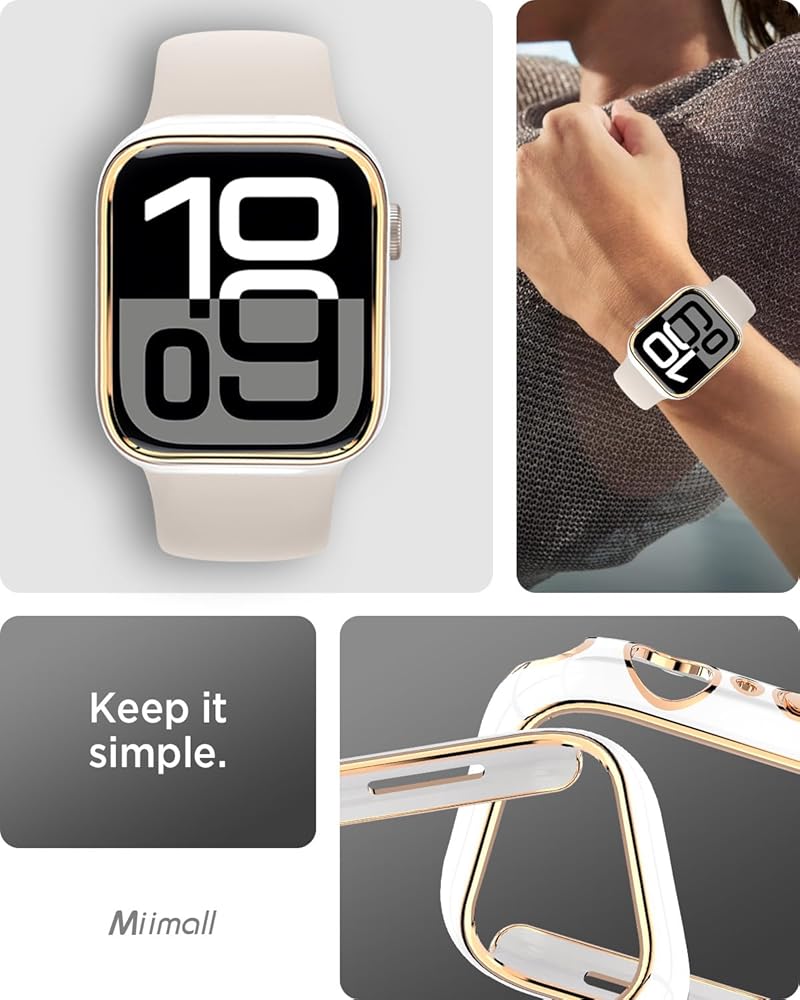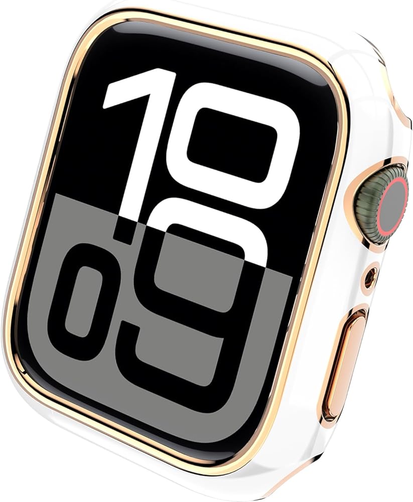 حافظة Miimall متوافقة مع ساعة Apple Watch 10 مقاس 46 مم، غطاء وجه واقٍ كامل نحيف وخفيف الوزن للنساء والرجال، واقي إطار صلب من البولي كربونات لساعة iWatch 46 مم (أبيض + ذهبي وردي)
