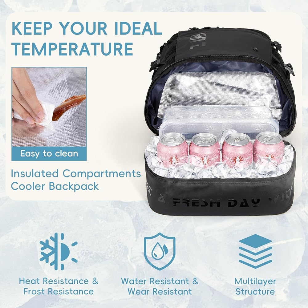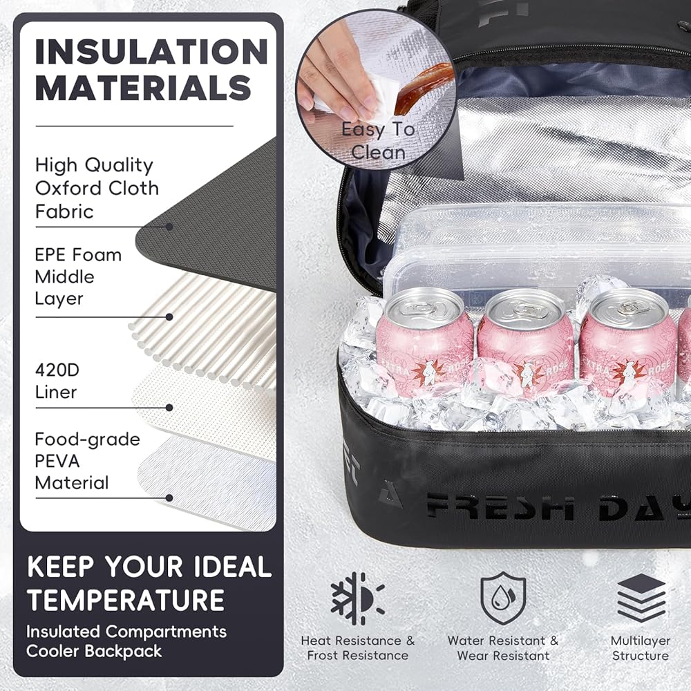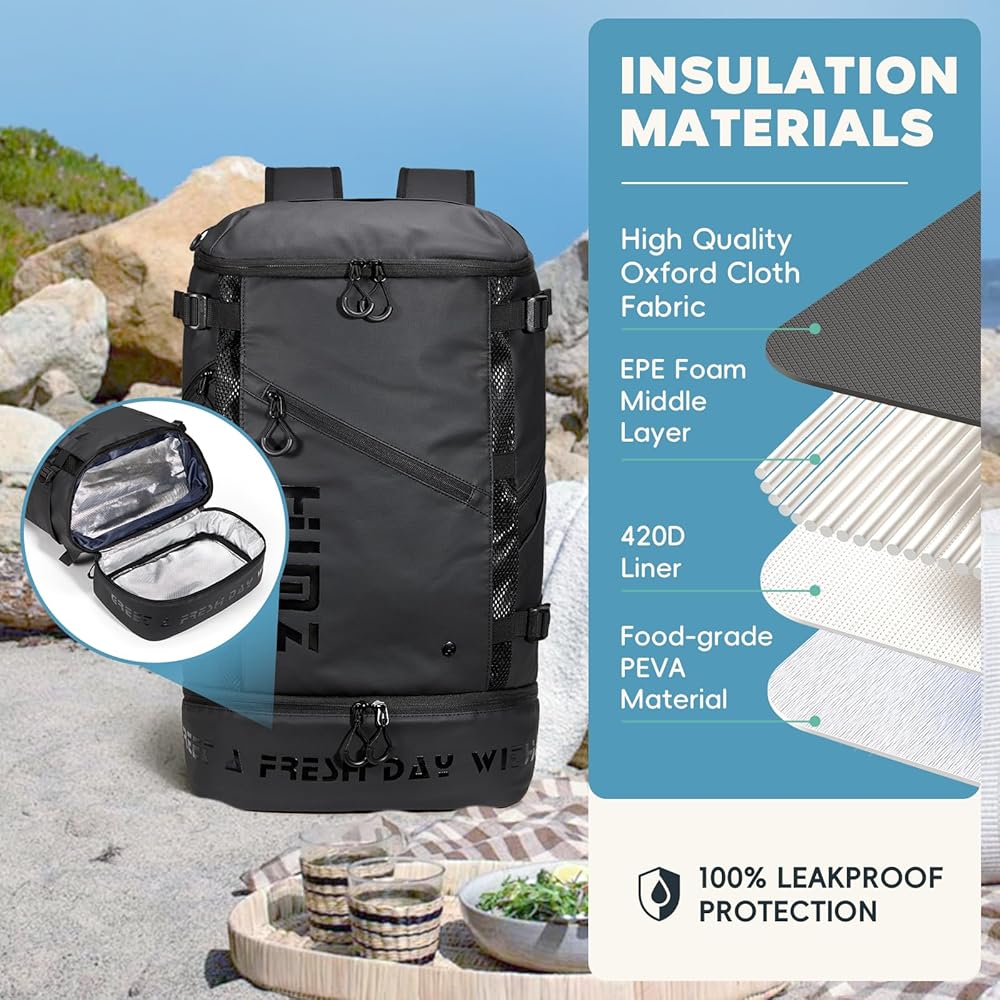 [معزول ومضاد للتسرب] تتميز الحجرة السفلية لحقيبة الظهر المبردة للتخييم بجيب بسحاب معزول مانع للتسرب، مما يضمن بقاء طعامك سليمًا ويحافظ على درجة حرارته لمدة تصل إلى 8 ساعات. العزل بسمك 8 مم مع بطانة PEVA الفضية المتقدمة يجعلها سهلة التنظيف ومثالية لحمل ما يصل إلى 8 علب أو صناديق غداء أو فواكه.