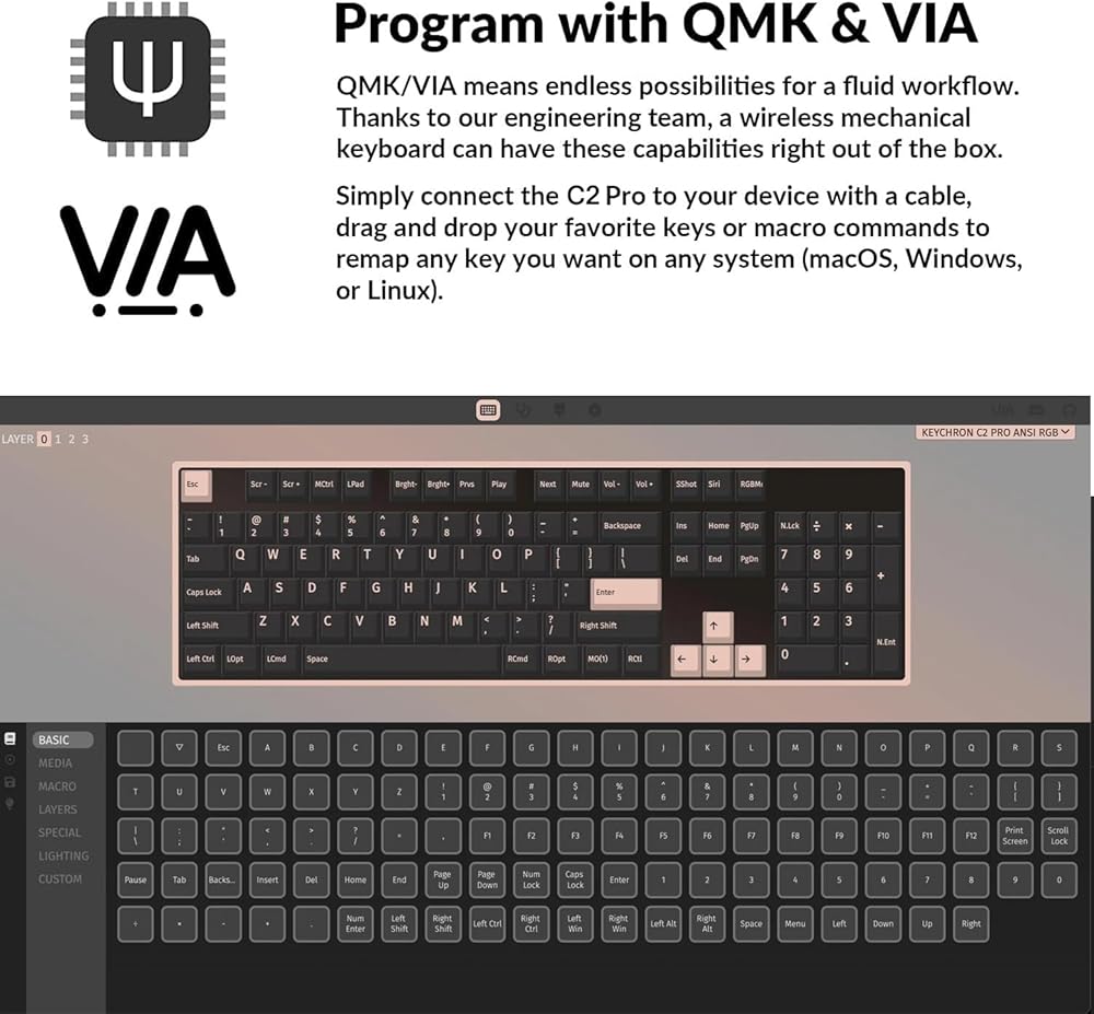 • دعم QMK وVIA - يسمح Keychron C2 Pro لأي شخص بإعادة تعيين أي مفتاح وإنشاء أوامر ماكرو أو اختصارات أو مفاتيح مجمعة من خلال VIA. ما عليك سوى توصيل C2 Pro بجهازك باستخدام كابل، وسحب وإسقاط مفاتيحك المفضلة أو أوامر الماكرو لإعادة تعيين أي مفتاح تريده على أي نظام (macOS، أو Windows، أو Linux). ملاحظة: يمكن للمستخدم إعادة تعيين المفتاح في الوضع السلكي فقط. بمجرد الانتهاء من ذلك، ستعمل خريطة المفاتيح على الوضعين اللاسلكي والسلكي.