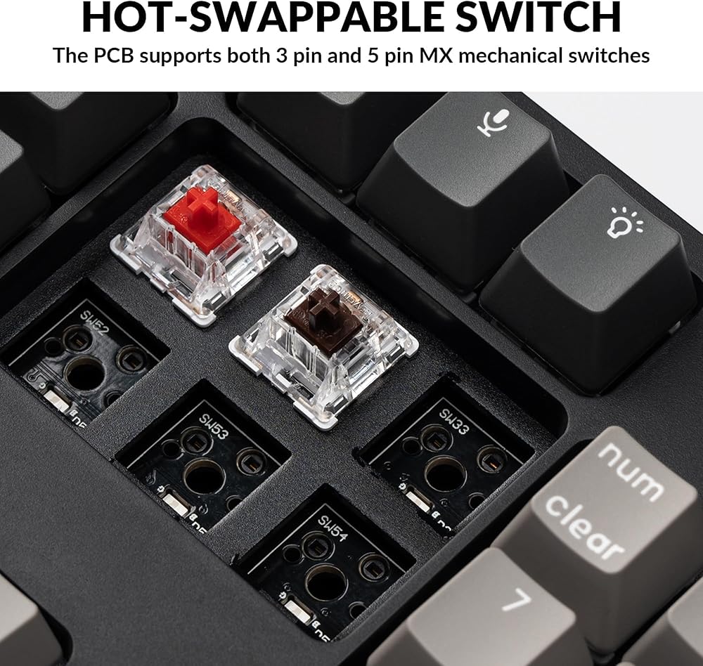 • دعم قابل للتبديل السريع - مع المفتاح الأحمر الميكانيكي Keychron K Pro المُشحم مسبقًا، مما يوفر استجابة لمسية لا مثيل لها مع عمر يصل إلى 50 مليون ضغطة مفتاح. يمكنك أيضًا تبديل C2 Pro مع جميع المفاتيح الميكانيكية 3pin و5pin MX الموجودة في السوق تقريبًا (بما في ذلك Cherry وGateron وKailh وPanda وما إلى ذلك) دون الحاجة إلى لحام. تم تصميم المثبت اللولبي المثبت على PCB لـ "المفاتيح الكبيرة" مثل شريط المسافة والتحويل والإدخال والحذف لتقليل التذبذب والأداء السلس.