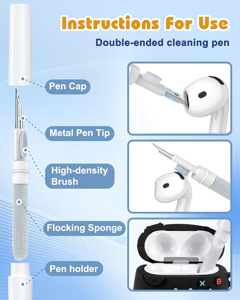 تشمل العبوة: 1 × لحافظة Airpods الجيل الرابع 2024، 1 × مشبك للتنزه سيرًا على الأقدام، و1 × قلم تنظيف. قلم التنظيف الثلاثة في واحد، الذي يسهل تنظيف الغبار أو الأوساخ العنيدة الموجودة على سماعات الرأس، مما يجعل سماعاتك تبدو وكأنها جديدة