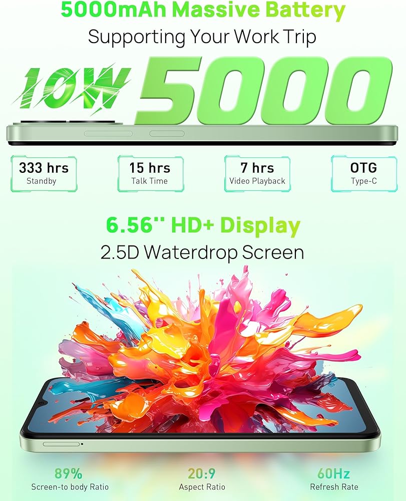 📱 شاشة HD+ مقاس 6.56 بوصة للعرض السينمائي - انغمس في شاشة HD+ واضحة ونابضة بالحياة مقاس 6.56 بوصة تضفي الحيوية على الصور. مع نسبة شاشة إلى الجسم تبلغ 89% ونسبة عرض إلى ارتفاع مريحة تبلغ 20:9، فإن خلية الشاشة الكبيرة هذه يعمل الهاتف على تحسين كل مقطع فيديو وصورة، مما يجعله مثاليًا للبث والاستخدام اليومي.