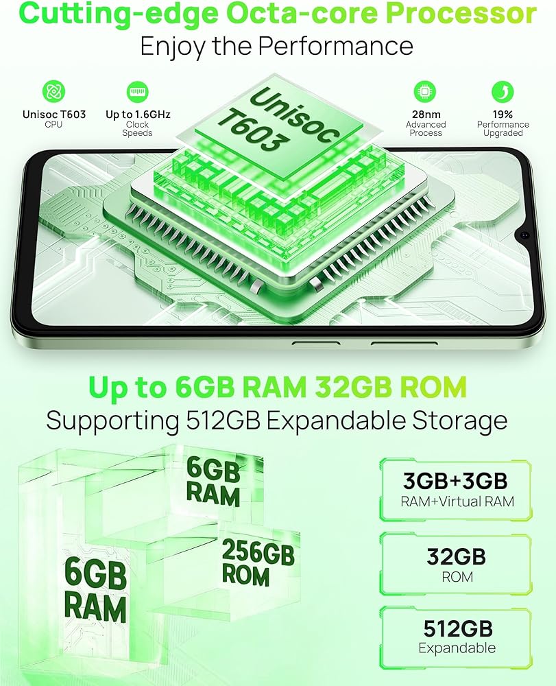 💾 مساحة تخزين كبيرة مع خيارات قابلة للتوسيع - مزود بذاكرة وصول عشوائي (RAM) سعة 6 جيجابايت (3 جيجابايت + 3 جيجابايت افتراضية) ومساحة تخزين داخلية تبلغ 32 جيجابايت، ويدعم Ulefone Note 19 أيضًا التوسعة حتى 512 جيجابايت. مثالي لتخزين الملفات والصور والتطبيقات الأساسية على هاتف Android غير المؤمّن، مع مرونة لإضافة المزيد حسب الحاجة.