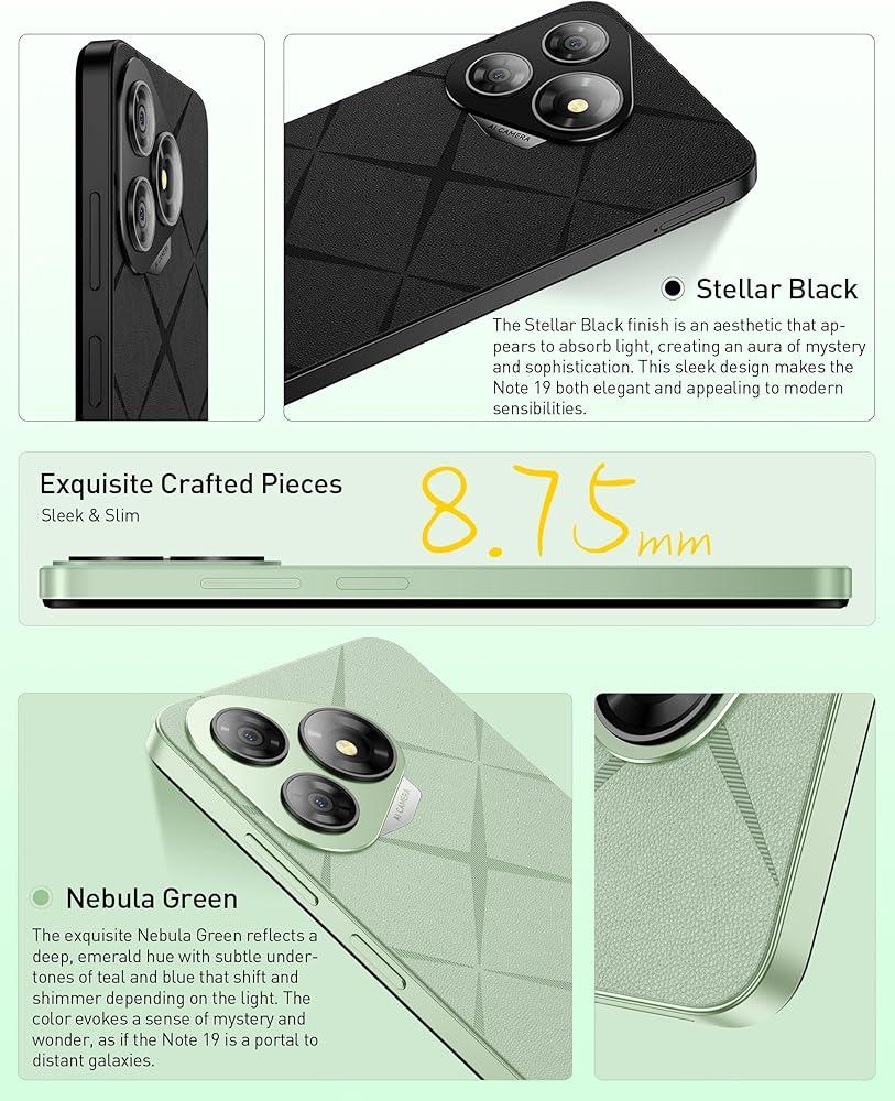🎨 تصميم أنيق وأنيق – يُبرز المظهر الجانبي النحيف لجهاز Note 19 مقاس 8.75 مم وخيارات الألوان الفريدة، بما في ذلك Stellar Black وNebula Green. تصميمه الأنيق مريح للحمل ومذهل بصريًا، ويوفر مظهرًا أنيقًا يتناسب مع الجماليات الحديثة.